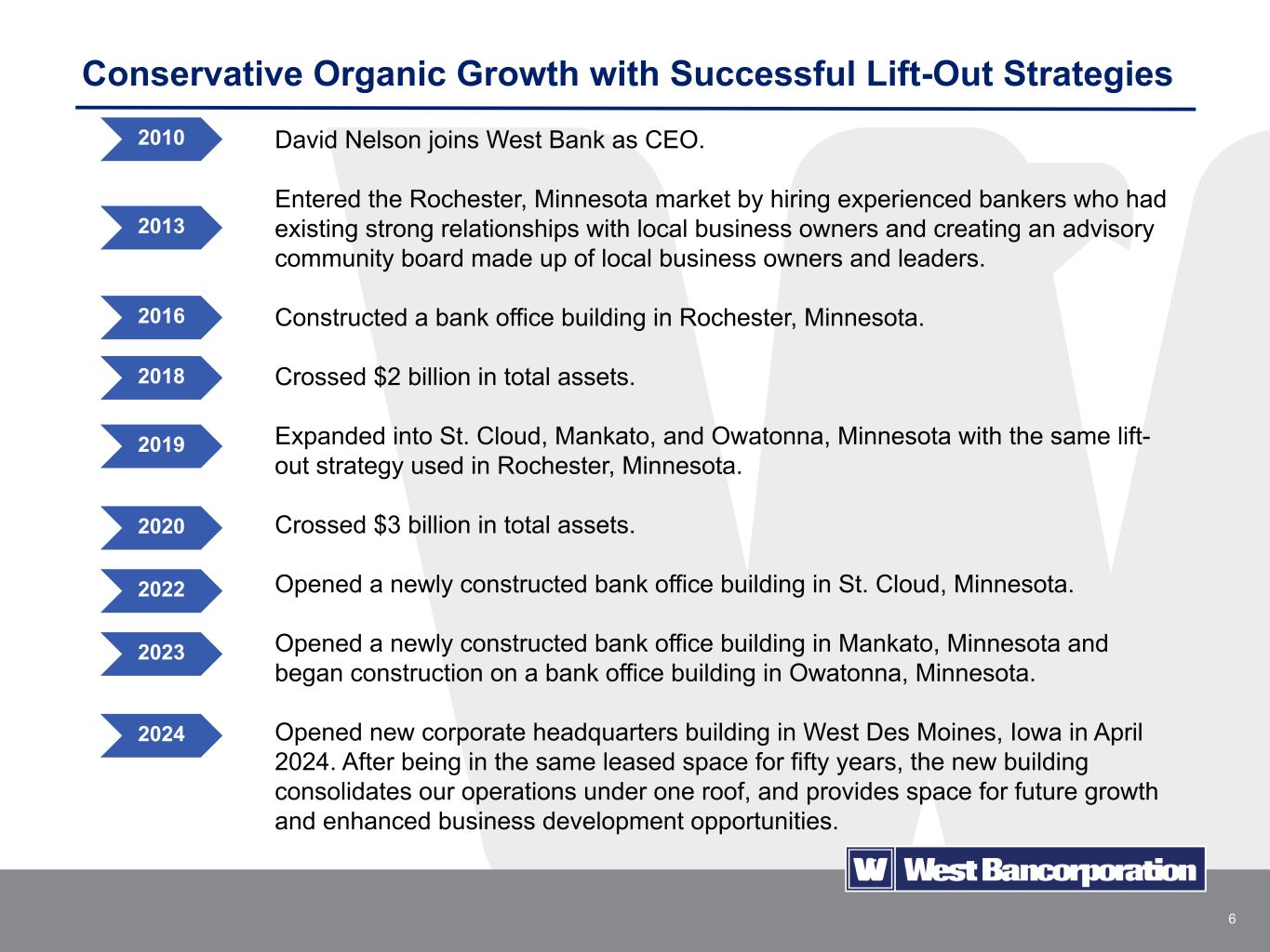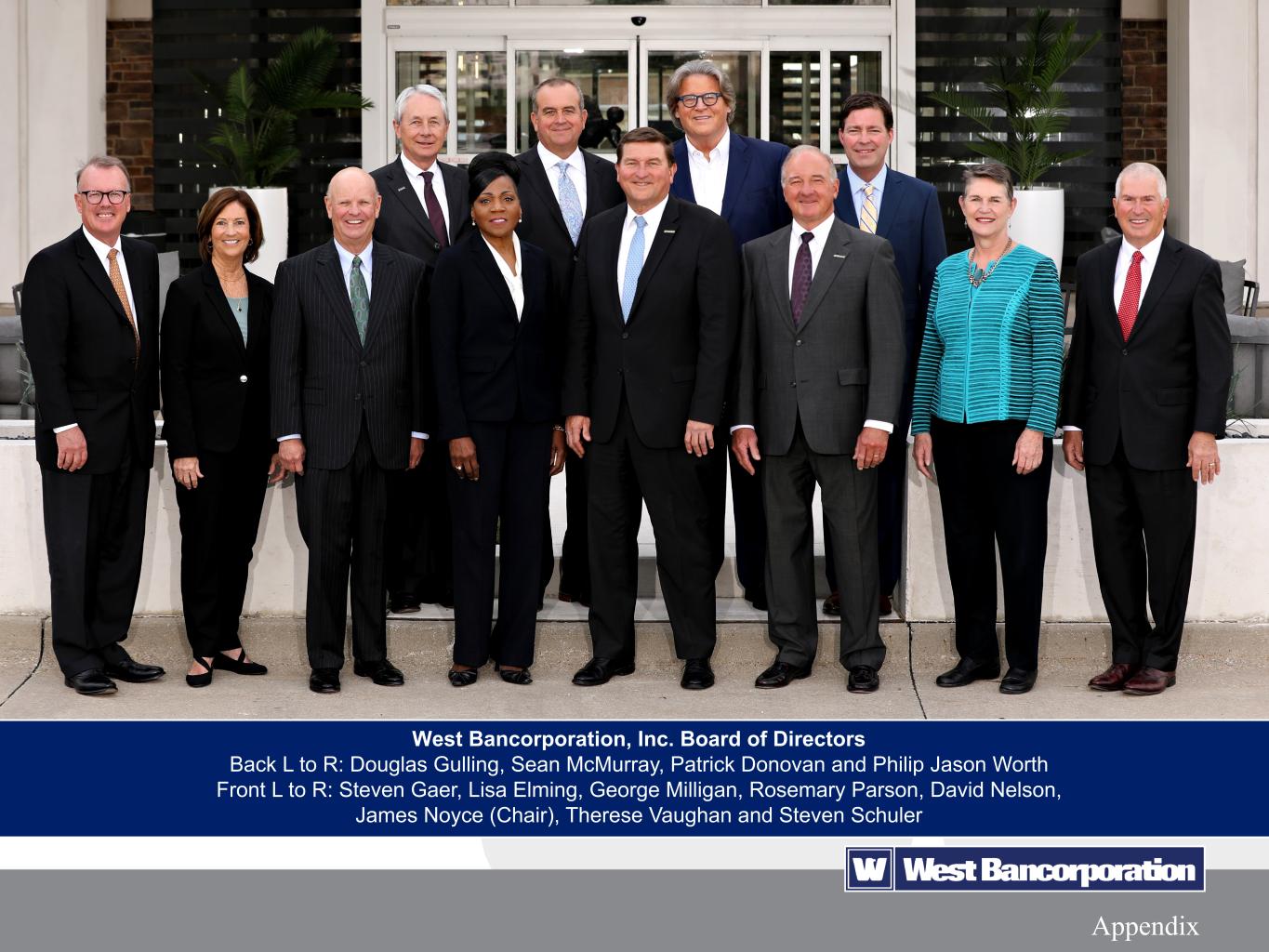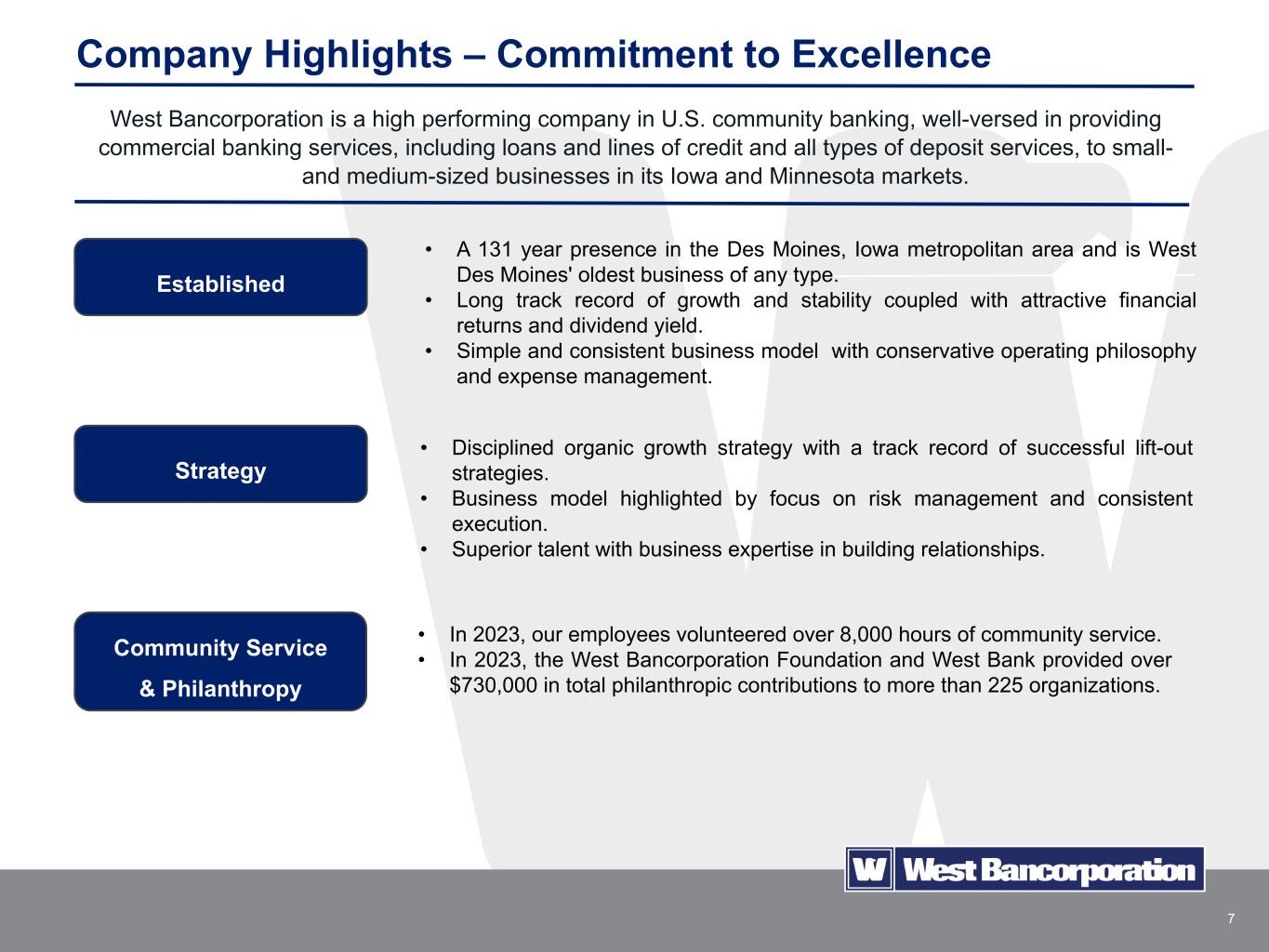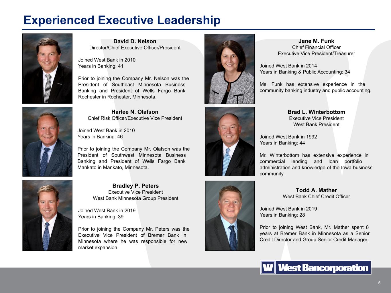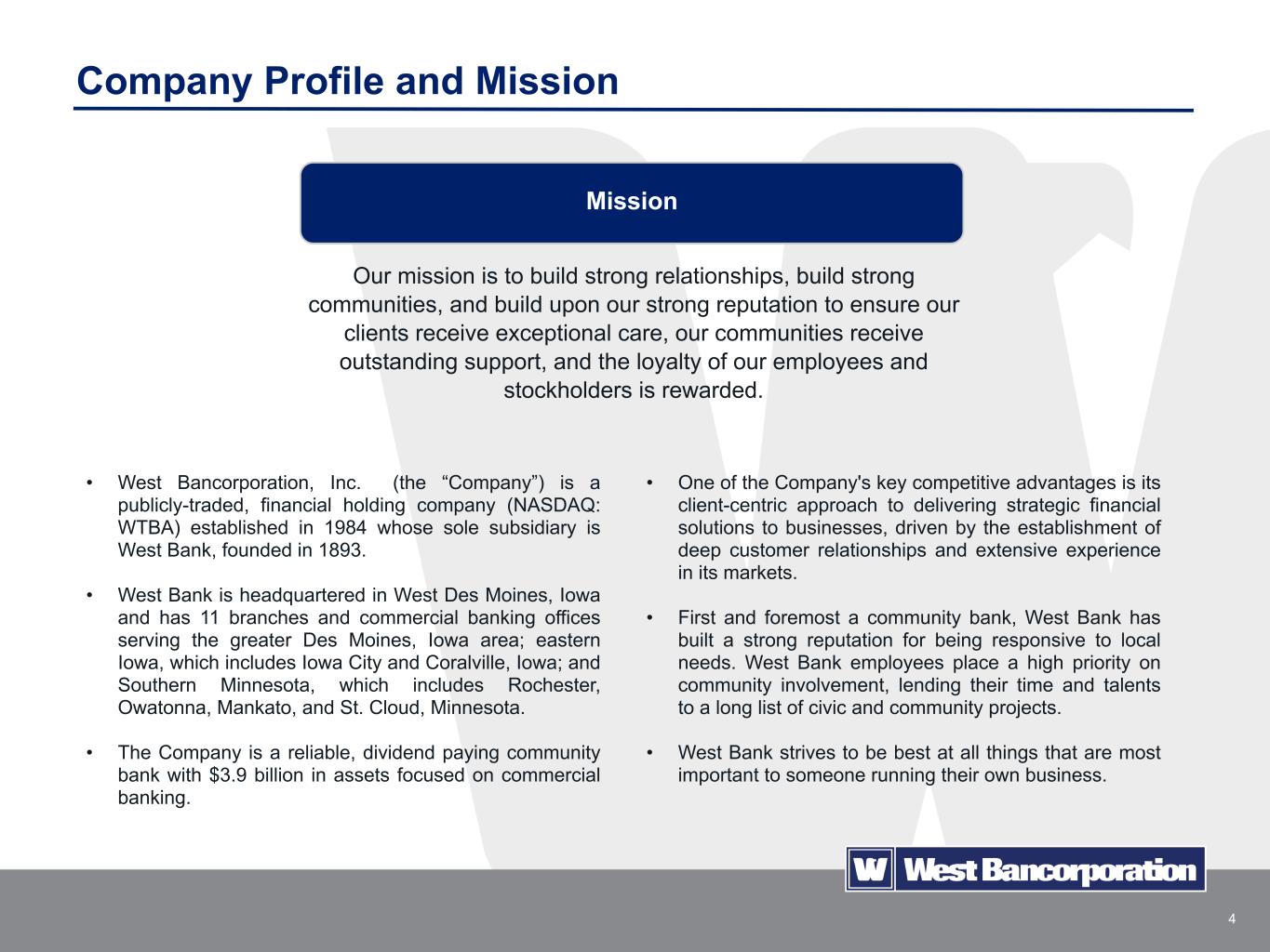 West Bancorporation, Inc. is headquartered in West Des Moines, Iowa. Serving customers since 1893, West Bank, a wholly-owned subsidiary of West Bancorporation, Inc., is a community bank that focuses on lending, deposit services, and trust services for small- to medium-sized businesses and consumers. West Bank has six offices in the Des Moines, Iowa metropolitan area, one office in Coralville, Iowa, and four offices in Minnesota in the cities of Rochester, Owatonna, Mankato and St. Cloud.