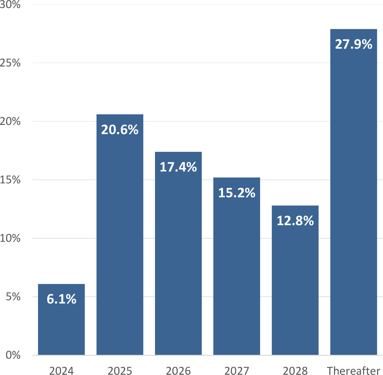 第2四半期の活動を含む2024年中に開始予定のリース契約は、合計4,804,999平方フィートで、すべて6ヶ月以上の契約期間となっている。これらのリースにより、当社は現金ベースで15.7%の賃料上昇を経験することになる。これらのリースは、2024年に満了するリース全体の65.1%に相当し、3,711,719平方フィートの更新リース(これらのリースの27.4%は契約更新に伴うもの)および1,093,280平方フィートの新規リースが含まれており、このうち137,090平方フィートが2024年開始時点で空室であった。