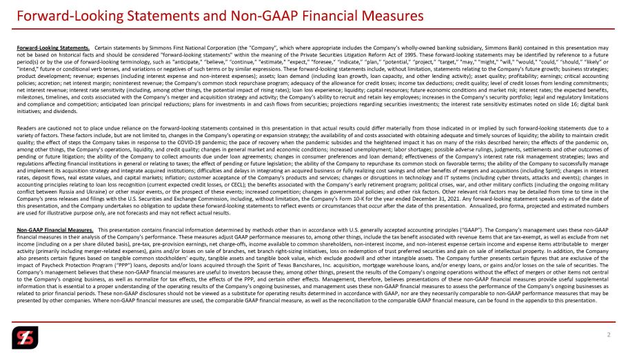 経営陣は、本日2022年10月25日(火)午前9時(米国中部標準時)から、この情報を確認するためのライブ・カンファレンスコールを実施します。興味のある方は、フリーダイヤル1-877-270-2148(北米のみ)にて、Simmons First National Corporation conference call, conference ID 10171429とお申し出いただければ、この電話会議をお聞きいただくことが可能です。また、この電話会議は、ライブまたは録音版で、電話会議の日から少なくとも60日間、シモンズのウェブサイト(simmonsbank.com)で視聴することができます。