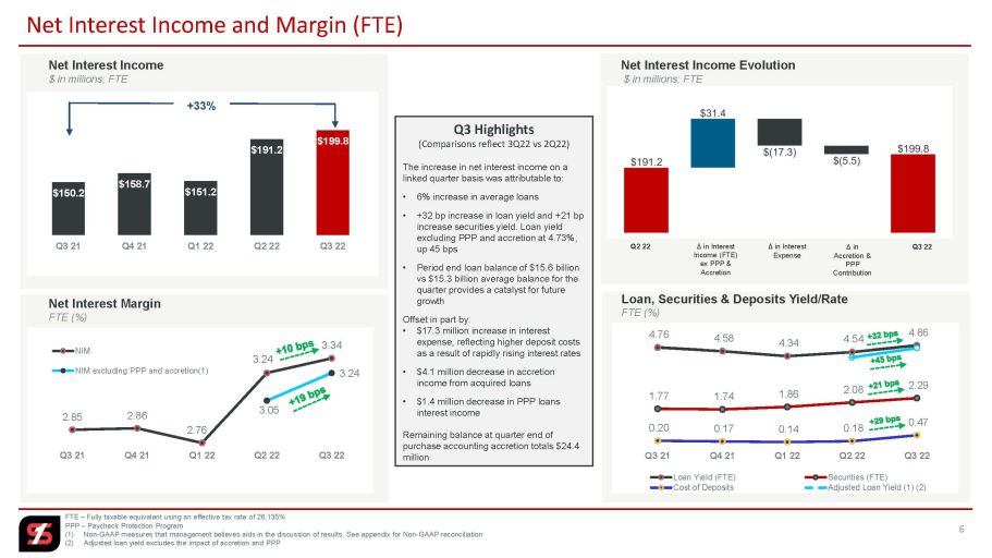 2022 年第 3 四半期の貸倒引当金は 0.1 百万ドル、2022 年第 2 四半期は 33.9 百万ドル、2021 年第 3 四半期は 19.9 百万ドルの引当金再取崩しでした。2022 年第 3 四半期末の貸付金に対する貸倒引当金は、2022 年第 2 四半期末が 212.6 百万ドル、2021 年第 3 四半期末が 202.5 百万ドルであったのに対して、197.6 百万ドルでした。貸出金全体に対する貸倒引当金は、2022 年第 2 四半期末に 1.41%、2021 年第 3 四半期末に 1.87%でしたが、当四半期末は 1.27%となりました。不良債権引当率は、2022 年第 2 四半期末に 334%、2021 年第 3 四半期末に 341%でしたが、当四半期末は 342%となりました。未実行約款に対する引当金は、2022 年第 3 四半期末に 4190 万ドル、2021 年第 3 四半期末に 2590 万ドル、2021 年第 3 四半期末に 2240 万ドルとなりました。