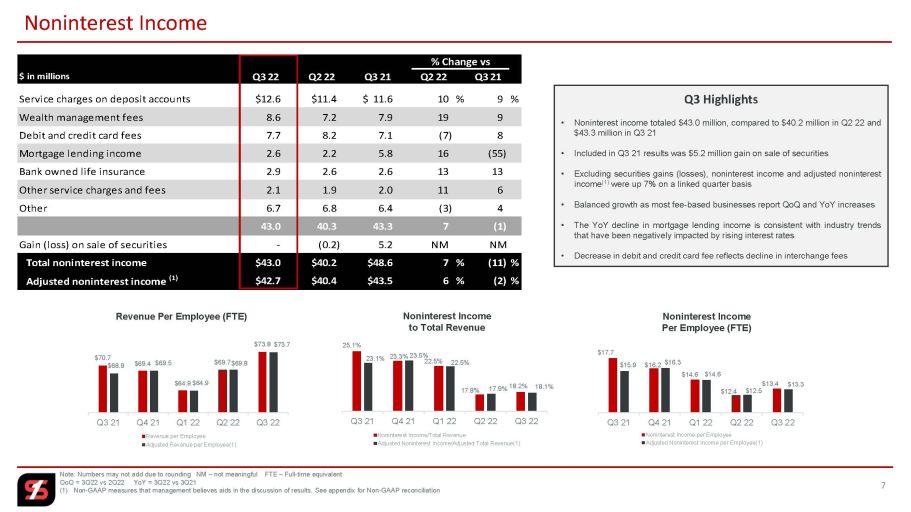 ローン・ポートフォリオの質は引き続き高く、信用度の指標は歴史的な低水準にありますが、様々な地域やセグメントでストレスや弱さの兆候がないか注意深く監視を続けています。2022 年第 3 四半期末の不良債権総額は、2022 年第 2 四半期末の 6360 万ドルから 580 万ドル減少し、2021 年第 3 四半期末の 5940 万ドルから 160 万ドル減少して 5780 万ドルでした。総資産に占める不良資産合計の割合は、2022 年第 2 四半期末に 0.26%、2021 年第 3 四半期末に 0.31%でしたが、2022 年第 3 四半期末には 0.23%となりました。当四半期のローン償却は回収により相殺され、正味償却率は、2022 年第 2 四半期の 2bp、2021 年第 3 四半期の 17bp に対し、1bp 未満となりました。