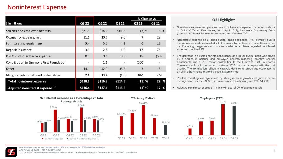 シモンズ・ファースト・ナショナル・コーポレーション(NASDAQ: SFNC)(以下、シモンズまたは当社)は本日、2022年第3四半期の純利益が8060万ドル(2022年第2四半期は2750万ドル、2021年第3四半期は8060万ドル)となったことを発表しました。希薄化後1株当たり利益は、2022年第2四半期が0.21ドル、2021年第3四半期が0.74ドルだったのに対し、2022年第3四半期は0.63ドルでした。下表に示すように、2022 年第 3 四半期には、主に合併関連費用と支店の適正化費用からなる特定の項目が合計 170 万ドル(税引後)発生しました。2022 年第 2 四半期には、下表に示す特定の項目の合計が 3940 万ドル(税引後)となり、買収に関連して取得した貸付金および未積立約定に必要な 2 日目会計の引当金が含まれています。2021 年第 3 四半期の特定の項目は、下表のとおり、合計▲120 万ドル(税引後)でした。これらの項目を除いた調整後希薄化後一株当たり利益(1)は、2022 年第 3 四半期は 0.64 ドル、2022 年第 2 四半期は 0.52 ドル、2021 年第 3 四半期は 0.73 ドルでした。