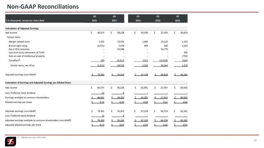 本プレスリリースには、米国で一般に公正妥当と認められた会計原則(GAAP)に準拠しない方法で測定された財務情報が含まれています。当社の経営陣はこれらの非GAAPベースの財務指標を当社の業績分析に使用しています。これらの指標は、特に非課税となる収益項目に関連した税効果を含めるために、GAAPベースの業績指標を調整し、当期純利益(希薄化後1株当たりを含む)、税引前利益、引当金純繰入額、普通株主に帰属する利益、金利外収益および金利外費用から合併活動(主に合併関連費用を含む)に起因する特定の収益および費用項目、支店売却損益、支店適正配置措置、信託優先証券償還損および知的財産売却益等を除外しております。また当社は、のれんおよびその他の無形固定資産を除く、有形固定資産、有形固定資産および有形固定資産簿価にもとづく 数値も表示しています。さらに、PPPローン、預金および/またはスピリット社の買収により取得したローン、モーゲージ・ ウェアハウス・ローンおよび/またはエネルギー・ローン、あるいは有価証券売却損益の影響を除いた数値を表示してい ます。これらのNon-GAAP財務指標は、特に、合併やその他の当社の継続事業の中心ではない項目の影響を排除し、税効果やPPPの影響、その他の一定の影響を正規化して、当社の継続事業の結果を表示しているため、投資家にとって有用であると当社は考えています。したがって、経営陣は、これらの非GAAPベースの財務指標は、継続事業の経営成績を正しく理解するために不可欠な有用な補足情報を提供すると考えており、過去の会計期間に関連する継続事業の業績を評価するために、これらの非GAAPベースの財務指標を使用しています。これらのNon-GAAPベースの開示は、GAAPに準拠して決定された経営成績の代用とみなされるべきではなく、また他社が提示するNon-GAAPベースの経営成績指標と必ずしも比較できるものではありません。非GAAPベースの財務指標が使用されている場合、同等のGAAPベースの財務指標、および同等のGAAPベースの財務指標への調整表は、本リリースの表中に記載されています。
