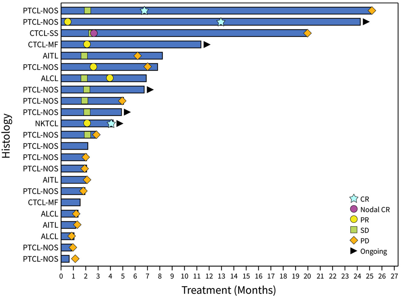 Figure 2: Swimmer Plot of Eligible Patient Population Demonstrating Response and Time on Therapy. Tumor histologies, as of January 22, 2024, are also shown indicating different types of T cell lymphoma. PTCL-NOS, peripheral T cell lymphoma not otherwise specified; CTCL, cutaneous T cell lymphoma of either Sezary or mycosis fungoides type; NKTCL, natural killer cell T cell lymphoma; ALCL, anaplastic large cell lymphoma; AITL, angioimmunoblastic T cell lymphoma.