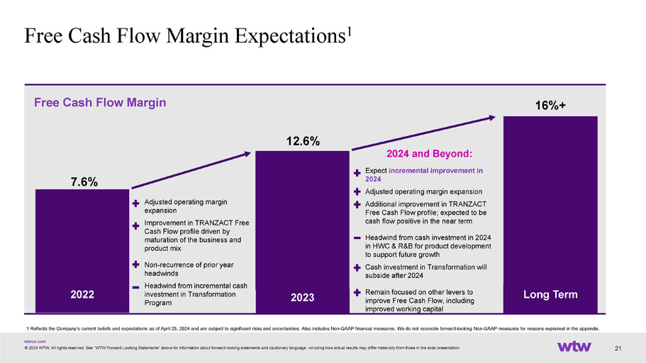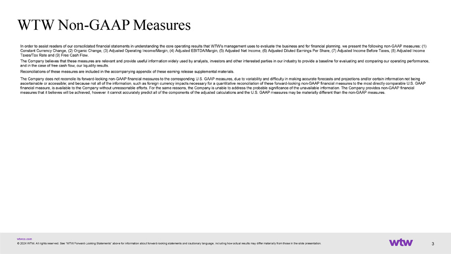 連結財務諸表の読者が、WTWの経営陣が事業の評価や財務計画のために使用している中核的な経営成績を理解するのを助けるために、当社は以下の非GAAP指標を提示している:(1) 為替変動調整後、(2) 有機的変動、(3) 調整後営業利益/マージン、(4) 調整後EBITDA/マージン、(5) 調整後純利益、(6) 調整後希薄化後1株当たり利益、(7) 調整後税引前利益、(8) 調整後法人所得税/税率、(9) フリー・キャッシュ・フロー、(10) フリー・キャッシュ・フロー・マージン。