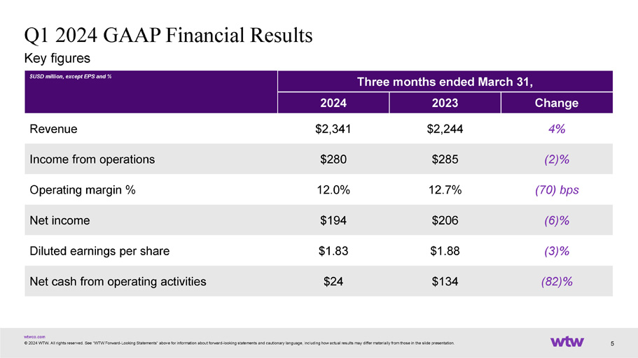 ロンドン 2024年4月25日 (GLOBE NEWSWIRE) -- 世界有数のアドバイザリー、ブローカー、ソリューション企業であるWTW (NASDAQ: WTW)(以下「当社」)は本日、2024年3月31日に終了した第1四半期の決算を発表した。