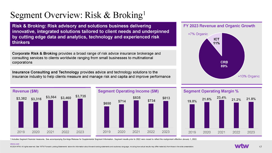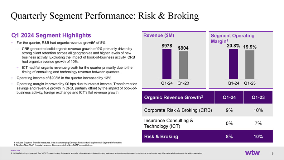 R&B 事業の 2024 年第 1 四半期の営業収益は、前年同期の 9.04 億ドルから 8%増加し、9.78 億ドルとなり ました(前年同期の為替変動の影響を除いたベースでは 8%の増加)。コーポレート・リスク&ブローキング(CRB)は、主に全地域で堅調な顧客維持と新規契約の増加によ り、既存事業ベースで増収となりました。インシュアランス・コンサルティング&テクノロジー(ICT)の既存事業売上高は、主にコンサルティングとテクノ ロジーの売上が四半期間で入れ替わるタイミングにより、前期並みの伸びとなりました。
