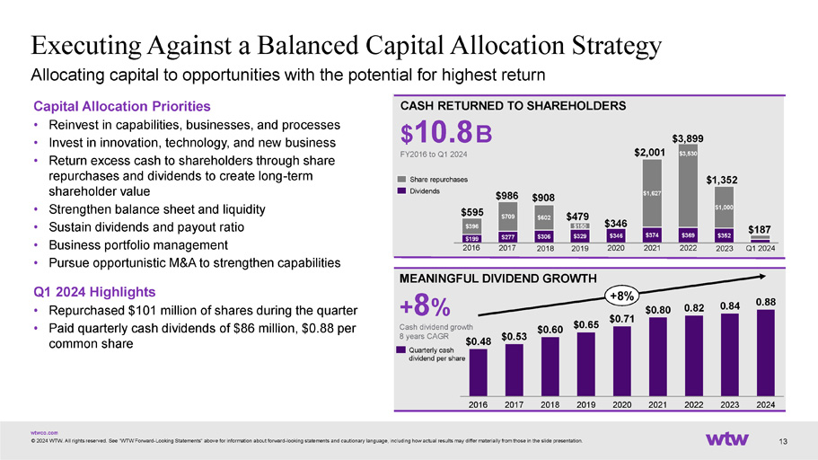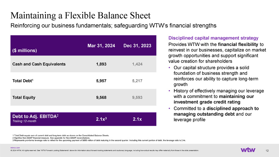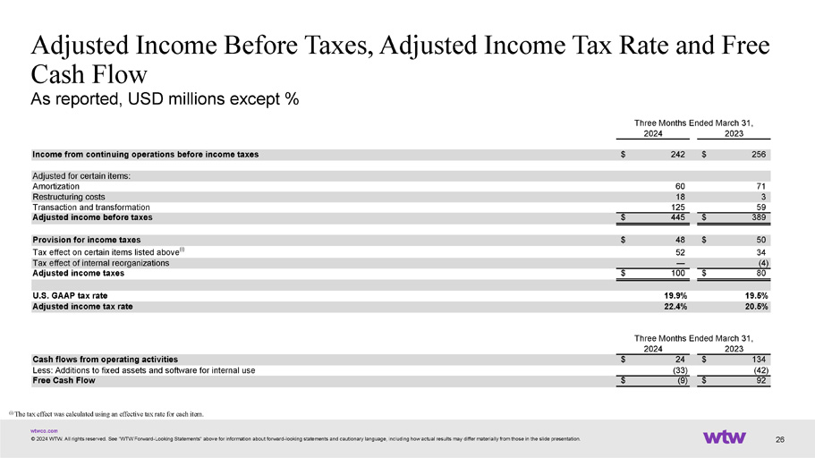 営業活動によるキャッシュ・フローは、前年同期の1億3,400万ドルに対し、2024年3月31日に終了した四半期は2,400万ドルであった。2024年3月31日に終了した四半期および2023年3月31日に終了した四半期のフリー・キャッシュ・フローは、それぞれ(9)百万ドルおよび92百万ドルで、101百万ドルの減少でした。これは主に、変革および裁量的報酬支払いに関連するキャッシュ流出の増加によるものですが、回収による流入の増加により一部相殺されました。2024年3月31日に終了した四半期に、当社はWTWの発行済み株式1億100万ドルを買い戻しました。