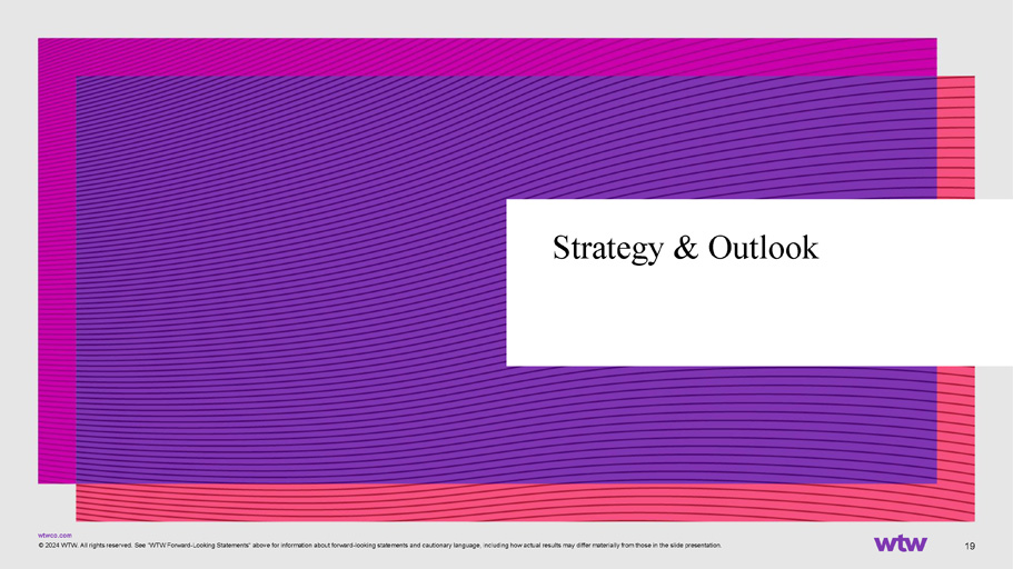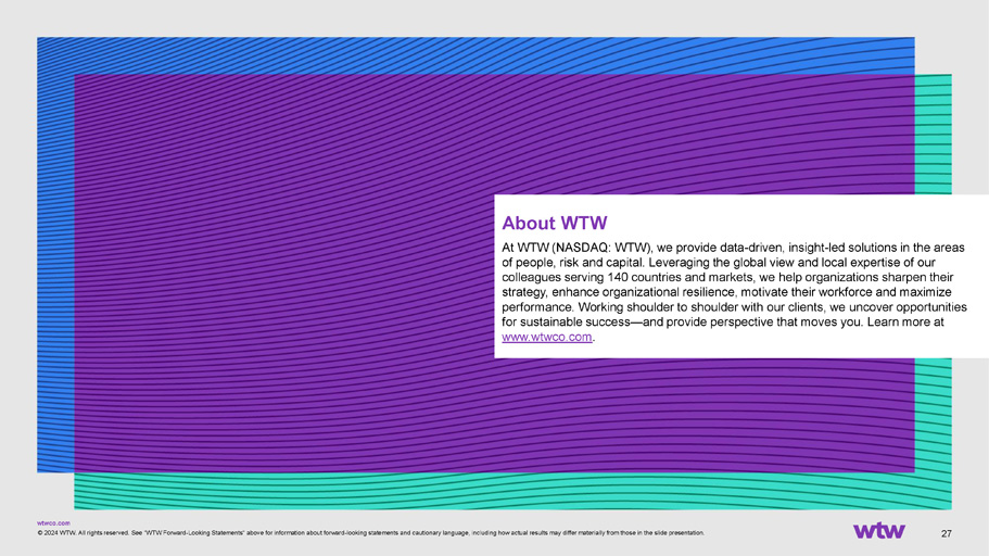 WTW(NASDAQ:WTW)は、人材、リスク、資本の分野において、データ主導、洞察主導のソリューションを提供しています。世界140の国と市場で事業を展開するWTWのグローバルな視点と各地域の専門知識を活用し、企業が戦略を研ぎ澄まし、組織の回復力を高め、従業員のモチベーションを高め、パフォーマンスを最大化できるよう支援します。クライアントと肩を並べ、持続可能な成功の機会を見出し、お客様の心を動かす視点を提供します。詳しくはwww.wtwco.com。