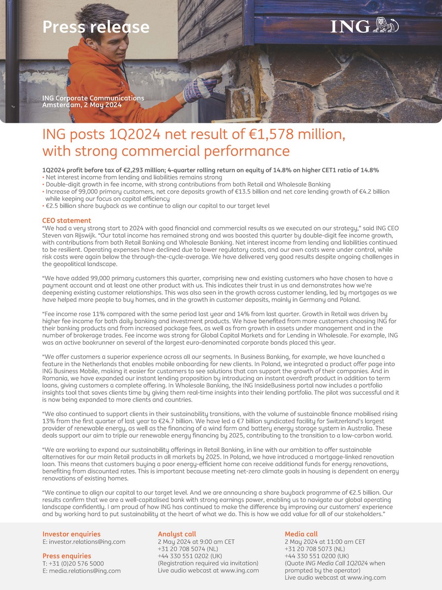 Press release ING Corporate Communications Amsterdam, 2 May 2024 ING posts 1Q2024 net result of €1,578 million, with strong commercial performance 1Q2024 profit before tax of €2,293 million; 4 - quarter rolling return on equity of 14.8% on higher CET1 ratio of 14.8% • Net interest income from lending and liabilities remains strong • Double - digit growth in fee income, with strong contributions from both Retail and Wholesale Banking • Increase of 99,000 primary customers, net core deposits growth of €13.5 billion and net core lending growth of €4.2 billion while keeping our focus on capital efficiency • €2.5 billion share buyback as we continue to align our capital to our target level CEO statement “We had a very strong start to 2024 with good financial and commercial results as we executed on our strategy,” said ING CEO Steven van Rijswijk. “Our total income has remained strong and was boosted this quarter by double - digit fee income growth, with contributions from both Retail Banking and Wholesale Banking. Net interest income from lending and liabilities continued to be resilient. Operating expenses have declined due to lower regulatory costs, and our own costs were under control, while risk costs were again below the through - the - cycle - average. We have delivered very good results despite ongoing challenges in the geopolitical landscape. “We have added 99,000 primary customers this quarter, comprising new and existing customers who have chosen to have a payment account and at least one other product with us. This indicates their trust in us and demonstrates how we’re deepening existing customer relationships. This was also seen in the growth across customer lending, led by mortgages as we have helped more people to buy homes, and in the growth in customer deposits, mainly in Germany and Poland. “Fee income rose 11% compared with the same period last year and 14% from last quarter. Growth in Retail was driven by higher fee income for both daily banking and investment products. We have benefited from more customers choosing ING for their banking products and from increased package fees, as well as from growth in assets under management and in the number of brokerage trades. Fee income was strong for Global Capital Markets and for Lending in Wholesale. For example, ING was an active bookrunner on several of the largest euro - denominated corporate bonds placed this year. “We offer customers a superior experience across all our segments. In Business Banking, for example, we have launched a feature in the Netherlands that enables mobile onboarding for new clients. In Poland, we integrated a product offer page into ING Business Mobile, making it easier for customers to see solutions that can support the growth of their companies. And in Romania, we have expanded our instant lending proposition by introducing an instant overdraft product in addition to term loans, giving customers a complete offering. In Wholesale Banking, the ING InsideBusiness portal now includes a portfolio insights tool that saves clients time by giving them real - time insights into their lending portfolio. The pilot was successful and it is now being expanded to more clients and countries. “We also continued to support clients in their sustainability transitions, with the volume of sustainable finance mobilised rising 13% from the first quarter of last year to €24.7 billion. We have led a €7 billion syndicated facility for Switzerland’s largest provider of renewable energy, as well as the financing of a wind farm and battery energy storage system in Australia. These deals support our aim to triple our renewable energy financing by 2025, contributing to the transition to a low - carbon world. “We are working to expand our sustainability offerings in Retail Banking, in line with our ambition to offer sustainable alternatives for our main Retail products in all markets by 2025. In Poland, we have introduced a mortgage - linked renovation loan. This means that customers buying a poor energy - efficient home can receive additional funds for energy renovations, benefiting from discounted rates. This is important because meeting net - zero climate goals in housing is dependent on energy renovations of existing homes. “We continue to align our capital to our target level . And we are announcing a share buyback programme of € 2 . 5 billion . Our results confirm that we are a well - capitalised bank with strong earnings power, enabling us to navigate our global operating landscape confidently . I am proud of how ING has continued to make the difference by improving our customers’ experience and by working hard to put sustainability at the heart of what we do . This is how we add value for all of our stakeholders .
