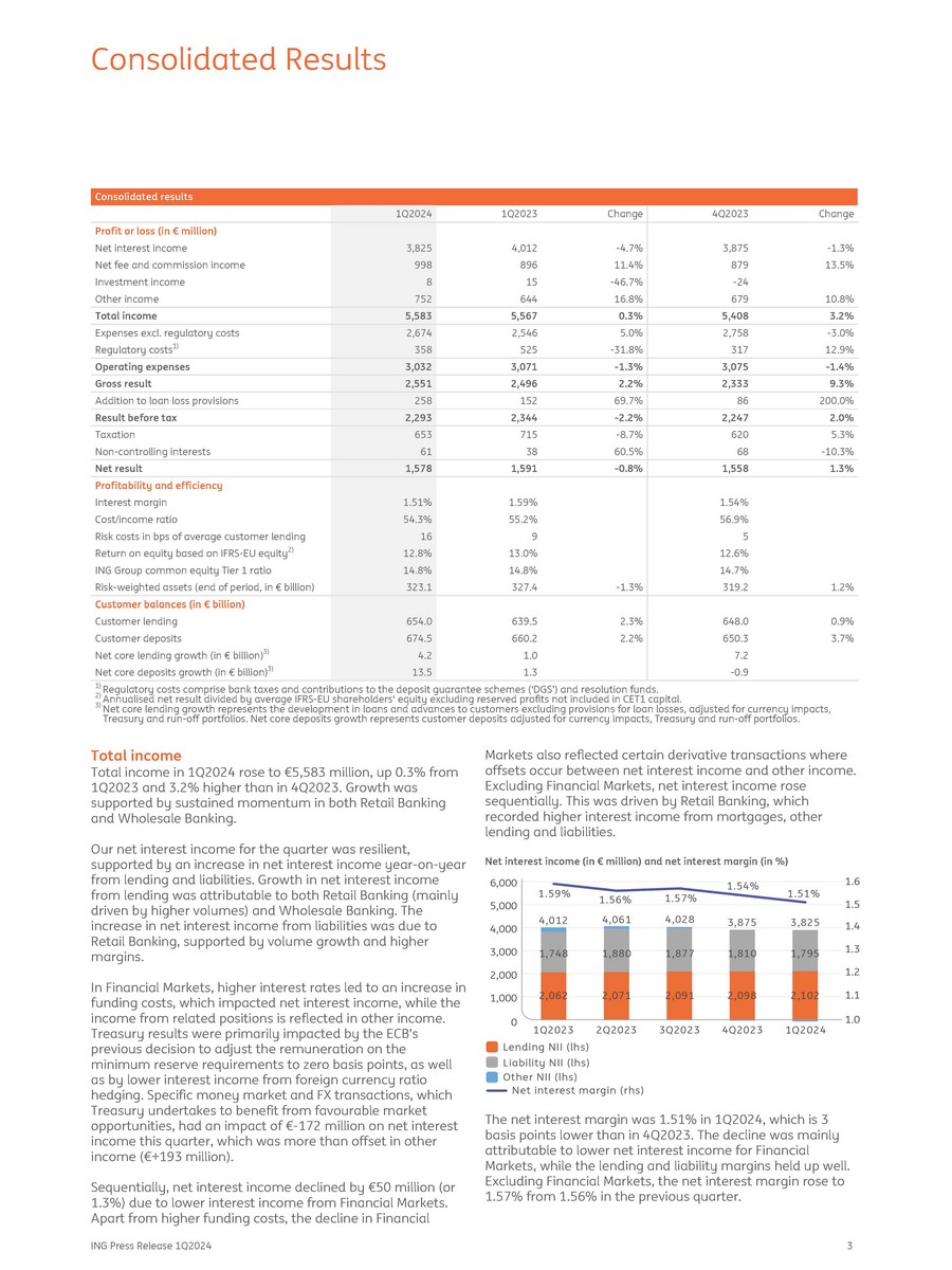 Consolidated results Change 4Q2023 Change 1Q2023 1Q2024 Profit or loss (in € million) - 1.3% 3,875 - 4.7% 4,012 3,825 Net interest income 13.5% 879 11.4% 896 998 Net fee and commission income - 24 - 46.7% 15 8 Investment income 10.8% 679 16.8% 644 752 Other income 3.2% 5,408 0.3% 5,567 5,583 Total income - 3.0% 2,758 5.0% 2,546 2,674 Expenses excl. regulatory costs 12.9% 317 - 31.8% 525 358 Regulatory costs 1) - 1.4% 3,075 - 1.3% 3,071 3,032 Operating expenses 9.3% 2,333 2.2% 2,496 2,551 Gross result 200.0% 86 69.7% 152 258 Addition to loan loss provisions 2.0% 2,247 - 2.2% 2,344 2,293 Result before tax 5.3% 620 - 8.7% 715 653 Taxation - 10.3% 68 60.5% 38 61 Non - controlling interests 1.3% 1,558 - 0.8% 1,591 1,578 Net result Profitability and efficiency 1.54% 1.59% 1.51% Interest margin 56.9% 55.2% 54.3% Cost/income ratio 5 9 16 Risk costs in bps of average customer lending 12.6% 13.0% 12.8% Return on equity based on IFRS - EU equity 2) 14.7% 14.8% 14.8% ING Group common equity Tier 1 ratio 1.2% 319.2 - 1.3% 327.4 323.1 Risk - weighted assets (end of period, in € billion) Customer balances (in € billion) 0.9% 648.0 2.3% 639.5 654.0 Customer lending 3.7% 650.3 2.2% 660.2 674.5 Customer deposits 7.2 1.0 4.2 Net core lending growth (in € billion) 3) - 0.9 1.3 13.5 Net core deposits growth (in € billion) 3) 1) Regulatory costs comprise bank taxes and contributions to the deposit guarantee schemes (‘DGS’) and resolution funds. 2) Annualised net result divided by average IFRS - EU shareholders' equity excluding reserved profits not included in CET1 capital. 3) Net core lending growth represents the development in loans and advances to customers excluding provisions for loan losses, adjusted for currency impacts, Treasury and run - off portfolios. Net core deposits growth represents customer deposits adjusted for currency impacts, Treasury and run - off portfolios. Total income Total income in 1Q2024 rose to €5,583 million, up 0.3% from 1Q2023 and 3.2% higher than in 4Q2023. Growth was supported by sustained momentum in both Retail Banking and Wholesale Banking. Our net interest income for the quarter was resilient, supported by an increase in net interest income year - on - year from lending and liabilities. Growth in net interest income from lending was attributable to both Retail Banking (mainly driven by higher volumes) and Wholesale Banking. The increase in net interest income from liabilities was due to Retail Banking, supported by volume growth and higher margins. In Financial Markets, higher interest rates led to an increase in funding costs, which impacted net interest income, while the income from related positions is reflected in other income. Treasury results were primarily impacted by the ECB’s previous decision to adjust the remuneration on the minimum reserve requirements to zero basis points, as well as by lower interest income from foreign currency ratio hedging. Specific money market and FX transactions, which Treasury undertakes to benefit from favourable market opportunities, had an impact of € - 172 million on net interest income this quarter, which was more than offset in other income (€+193 million). Sequentially, net interest income declined by €50 million (or 1.3%) due to lower interest income from Financial Markets. Apart from higher funding costs, the decline in Financial Markets also reflected certain derivative transactions where offsets occur between net interest income and other income. Excluding Financial Markets, net interest income rose sequentially. This was driven by Retail Banking, which recorded higher interest income from mortgages, other lending and liabilities. Net interest income (in € million) and net interest margin (in %) The net interest margin was 1.51% in 1Q2024, which is 3 basis points lower than in 4Q2023. The decline was mainly attributable to lower net interest income for Financial Markets, while the lending and liability margins held up well. Excluding Financial Markets, the net interest margin rose to 1.57% from 1.56% in the previous quarter. ING Press Release 1Q2024 3 Consolidated Results We recorded strong commercial growth in 1Q2024.