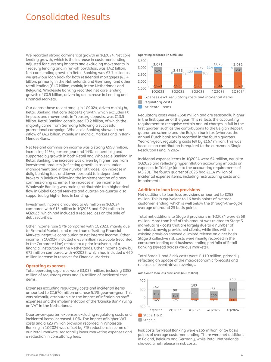 Net core lending growth, which is the increase in customer lending adjusted for currency impacts and excluding movements in Treasury lending and in run - off portfolios, was €4.2 billion. Net core lending growth in Retail Banking was €3.7 billion as we grew our loan book for both residential mortgages (€2.4 billion, primarily in the Netherlands and Germany) and other retail lending (€1.3 billion, mainly in the Netherlands and Belgium). Wholesale Banking recorded net core lending growth of €0.5 billion, driven by an increase in Lending and Financial Markets. Our deposit base rose strongly in 1Q2024, driven mainly by Retail Banking. Net core deposits growth, which excludes FX impacts and movements in Treasury deposits, was €13.5 billion. Retail Banking contributed €9.2 billion, of which the majority came from Germany following a successful promotional campaign. Wholesale Banking showed a net inflow of €4.3 billion, mainly in Financial Markets and in Bank Mendes Gans. Net fee and commission income was a strong €998 million, increasing 11% year - on - year and 14% sequentially and supported by growth in both Retail and Wholesale Banking. In Retail Banking, the increase was driven by higher fees from investment products (reflecting growth in assets under management and in the number of trades), an increase in daily banking fees and lower fees paid to independent brokers in Belgium following the implementation of a new commissioning scheme. The increase in fee income for Wholesale Banking was mainly attributable to a higher deal flow in Global Capital Markets and quarter - on - quarter also supported by higher fees in Lending. Investment income amounted to €8 million in 1Q2024 compared with €15 million in 1Q2023 and € - 24 million in 4Q2023, which had included a realised loss on the sale of debt securities. Other income rose 17% compared with 1Q2023, mainly due to Financial Markets and more than offsetting Financial Markets' negative contribution to net interest income. Other income in 1Q2024 included a €53 million receivable (recorded in the Corporate Line) related to a prior insolvency of a financial institution in the Netherlands. Other income grew by €73 million compared with 4Q2023, which had included a €60 million increase in reserves for Financial Markets. Operating expenses Total operating expenses were €3,032 million, including €358 million of regulatory costs and €4 million of incidental cost items. Expenses excluding regulatory costs and incidental items amounted to €2,670 million and rose 5.1% year - on - year. This was primarily attributable to the impact of inflation on staff expenses and the implementation of the ‘Danske Bank’ ruling on VAT in the Netherlands. Quarter - on - quarter, expenses excluding regulatory costs and incidental items increased 1.0%. The impact of higher VAT costs and a €23 million provision recorded in Wholesale Banking in 1Q2024 was offset by FTE reductions in some of our Retail markets, seasonally lower marketing expenses and a reduction in consultancy fees. Operating expenses (in € million) Regulatory costs were €358 million and are seasonally higher in the first quarter of the year. This reflects the accounting requirement to recognise certain annual charges in full in the first quarter, such as the contributions to the Belgian deposit guarantee scheme and the Belgian bank tax (whereas the annual Dutch bank tax is recorded in the fourth quarter). Year - on - year, regulatory costs fell by € 167 million . This was because no contribution is required to the eurozone's Single Resolution Fund in 2024 . Incidental expense items in 1Q2024 were €4 million, equal to 1Q2023 and reflecting hyperinflation accounting impacts on expenses in Türkiye (due to the accounting requirements of IAS 29). The fourth quarter of 2023 had €114 million of incidental expense items, including restructuring costs and impairments. Addition to loan loss provisions Net additions to loan loss provisions amounted to €258 million. This is equivalent to 16 basis points of average customer lending, which is well below the through - the - cycle average of around 25 basis points. Total net additions to Stage 3 provisions in 1Q2024 were €368 million. More than half of this amount was related to Stage 3 individual risk costs that are largely due to a number of unrelated, newly provisioned clients, while files with an existing provision showed a limited release on a net basis. Stage 3 collective risk costs were mainly recorded in the consumer lending and business lending portfolio of Retail Banking (spread across various markets). Total Stage 1 and 2 risk costs were € - 110 million, primarily reflecting an update of the macroeconomic forecasts and releases of event - driven overlays . Addition to loan loss provisions (in € million) Risk costs for Retail Banking were €165 million, or 14 basis points of average customer lending. There were net additions in Poland, Belgium and Germany, while Retail Netherlands showed a net release in risk costs. ING Press Release 1Q2024 4 Consolidated Results Wholesale Banking recorded €93 million of risk costs, or 20 basis points of average customer lending.