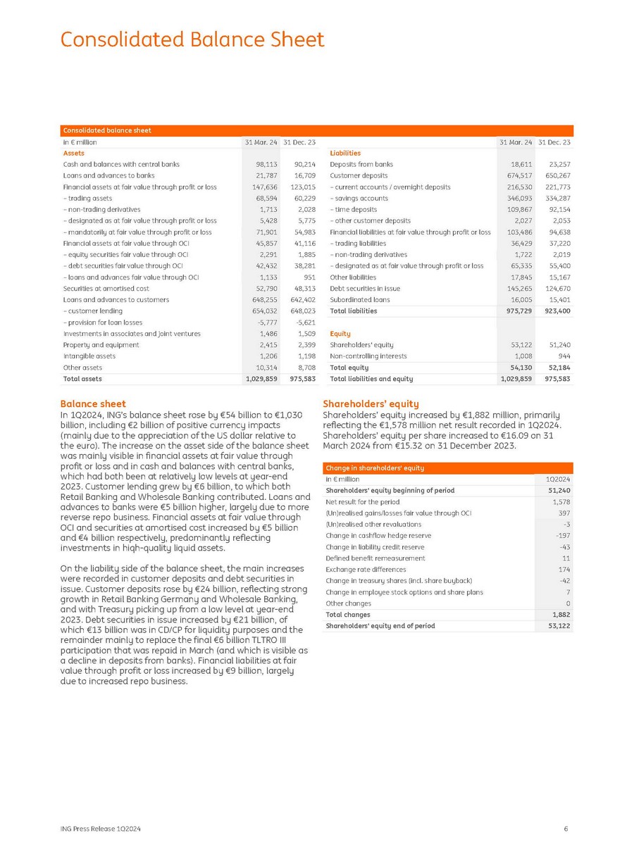 ING Press Release 1Q2024 6 Consolidated balance sheet 31 Dec. 23 31 Mar. 24 31 Dec. 23 31 Mar. 24 in € million Liabilities Assets 23,257 18,611 Deposits from banks 90,214 98,113 Cash and balances with central banks 650,267 674,517 Customer deposits 16,709 21,787 Loans and advances to banks 221,773 216,530 – current accounts / overnight deposits 123,015 147,636 Financial assets at fair value through profit or loss 334,287 346,093 – savings accounts 60,229 68,594 – trading assets 92,154 109,867 – time deposits 2,028 1,713 – non - trading derivatives 2,053 2,027 – other customer deposits 5,775 5,428 – designated as at fair value through profit or loss 94,638 103,486 Financial liabilities at fair value through profit or loss 54,983 71,901 – mandatorily at fair value through profit or loss 37,220 36,429 – trading liabilities 41,116 45,857 Financial assets at fair value through OCI 2,019 1,722 – non - trading derivatives 1,885 2,291 – equity securities fair value through OCI 55,400 65,335 – designated as at fair value through profit or loss 38,281 42,432 – debt securities fair value through OCI 15,167 17,845 Other liabilities 951 1,133 – loans and advances fair value through OCI 124,670 145,265 Debt securities in issue 48,313 52,790 Securities at amortised cost 15,401 16,005 Subordinated loans 642,402 648,255 Loans and advances to customers 923,400 975,729 Total liabilities 648,023 654,032 – customer lending - 5,621 - 5,777 – provision for loan losses Equity 1,509 1,486 Investments in associates and joint ventures 51,240 53,122 Shareholders' equity 2,399 2,415 Property and equipment 944 1,008 Non - controlling interests 1,198 1,206 Intangible assets 52,184 54,130 Total equity 8,708 10,314 Other assets 975,583 1,029,859 Total liabilities and equity 975,583 1,029,859 Total assets Balance sheet In 1Q2024, ING’s balance sheet rose by €54 billion to €1,030 billion, including €2 billion of positive currency impacts (mainly due to the appreciation of the US dollar relative to the euro). The increase on the asset side of the balance sheet was mainly visible in financial assets at fair value through profit or loss and in cash and balances with central banks, which had both been at relatively low levels at year - end 2023. Customer lending grew by €6 billion, to which both Retail Banking and Wholesale Banking contributed. Loans and advances to banks were €5 billion higher, largely due to more reverse repo business. Financial assets at fair value through OCI and securities at amortised cost increased by €5 billion and €4 billion respectively, predominantly reflecting investments in hiqh - quality liquid assets. On the liability side of the balance sheet, the main increases were recorded in customer deposits and debt securities in issue. Customer deposits rose by €24 billion, reflecting strong growth in Retail Banking Germany and Wholesale Banking, and with Treasury picking up from a low level at year - end 2023. Debt securities in issue increased by €21 billion, of which €13 billion was in CD/CP for liquidity purposes and the remainder mainly to replace the final €6 billion TLTRO III participation that was repaid in March (and which is visible as a decline in deposits from banks). Financial liabilities at fair value through profit or loss increased by €9 billion, largely due to increased repo business. Shareholders’ equity Shareholders’ equity increased by €1,882 million, primarily reflecting the €1,578 million net result recorded in 1Q2024. Shareholders’ equity per share increased to €16.09 on 31 March 2024 from €15.32 on 31 December 2023. Change in shareholders’ equity 1Q2024 in € million 51,240 Shareholders' equity beginning of period 1,578 Net result for the period 397 (Un)realised gains/losses fair value through OCI - 3 (Un)realised other revaluations - 197 Change in cashflow hedge reserve - 43 Change in liability credit reserve 11 Defined benefit remeasurement 174 Exchange rate differences - 42 Change in treasury shares (incl.
