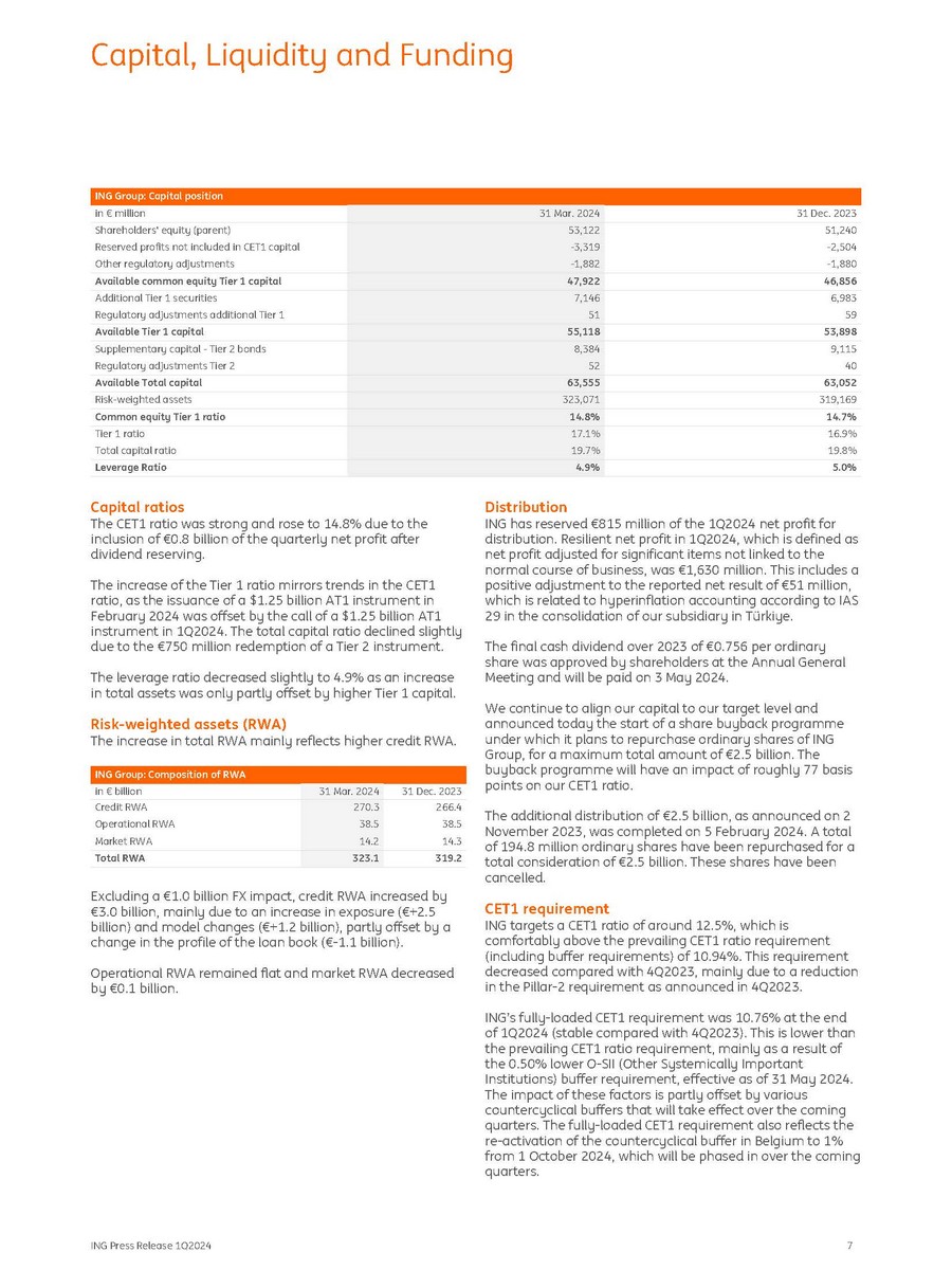 share buyback) 7 Change in employee stock options and share plans 0 Other changes 1,882 Total changes 53,122 Shareholders' equity end of period Consolidated Balance Sheet ING Group: Capital position 31 Dec. 2023 31 Mar. 2024 in € million 51,240 - 2,504 - 1,880 53,122 - 3,319 - 1,882 Shareholders' equity (parent) Reserved profits not included in CET1 capital Other regulatory adjustments 46,856 47,922 Available common equity Tier 1 capital 6,983 59 7,146 51 Additional Tier 1 securities Regulatory adjustments additional Tier 1 53,898 55,118 Available Tier 1 capital 9,115 8,384 Supplementary capital - Tier 2 bonds 40 52 Regulatory adjustments Tier 2 63,052 63,555 Available Total capital 319,169 323,071 Risk - weighted assets 14.7% 14.8% Common equity Tier 1 ratio 16.9% 17.1% Tier 1 ratio 19.8% 19.7% Total capital ratio 5.0% 4.9% Leverage Ratio Capital ratios The CET1 ratio was strong and rose to 14.8% due to the inclusion of €0.8 billion of the quarterly net profit after dividend reserving. The increase of the Tier 1 ratio mirrors trends in the CET1 ratio, as the issuance of a $1.25 billion AT1 instrument in February 2024 was offset by the call of a $1.25 billion AT1 instrument in 1Q2024. The total capital ratio declined slightly due to the €750 million redemption of a Tier 2 instrument. The leverage ratio decreased slightly to 4.9% as an increase in total assets was only partly offset by higher Tier 1 capital. Risk - weighted assets (RWA) The increase in total RWA mainly reflects higher credit RWA. ING Group: Composition of RWA ING Press Release 1Q2024 7 31 Dec. 2023 31 Mar. 2024 in € billion 266.4 270.3 Credit RWA 38.5 38.5 Operational RWA 14.3 14.2 Market RWA 319.2 323.1 Total RWA Excluding a €1.0 billion FX impact, credit RWA increased by €3.0 billion, mainly due to an increase in exposure (€+2.5 billion) and model changes (€+1.2 billion), partly offset by a change in the profile of the loan book (€ - 1.1 billion). Operational RWA remained flat and market RWA decreased by €0.1 billion. Distribution ING has reserved €815 million of the 1Q2024 net profit for distribution. Resilient net profit in 1Q2024, which is defined as net profit adjusted for significant items not linked to the normal course of business, was €1,630 million. This includes a positive adjustment to the reported net result of €51 million, which is related to hyperinflation accounting according to IAS 29 in the consolidation of our subsidiary in Türkiye. The final cash dividend over 2023 of €0.756 per ordinary share was approved by shareholders at the Annual General Meeting and will be paid on 3 May 2024. We continue to align our capital to our target level and announced today the start of a share buyback programme under which it plans to repurchase ordinary shares of ING Group, for a maximum total amount of €2.5 billion. The buyback programme will have an impact of roughly 77 basis points on our CET1 ratio. The additional distribution of €2.5 billion, as announced on 2 November 2023, was completed on 5 February 2024. A total of 194.8 million ordinary shares have been repurchased for a total consideration of €2.5 billion. These shares have been cancelled. CET1 requirement ING targets a CET1 ratio of around 12.5%, which is comfortably above the prevailing CET1 ratio requirement (including buffer requirements) of 10.94%. This requirement decreased compared with 4Q2023, mainly due to a reduction in the Pillar - 2 requirement as announced in 4Q2023. ING’s fully - loaded CET1 requirement was 10.76% at the end of 1Q2024 (stable compared with 4Q2023). This is lower than the prevailing CET1 ratio requirement, mainly as a result of the 0.50% lower O - SII (Other Systemically Important Institutions) buffer requirement, effective as of 31 May 2024. The impact of these factors is partly offset by various countercyclical buffers that will take effect over the coming quarters. The fully - loaded CET1 requirement also reflects the re - activation of the countercyclical buffer in Belgium to 1% from 1 October 2024, which will be phased in over the coming quarters. Capital, Liquidity and Funding MREL and TLAC requirements Minimum Required Eligible Liabilities (MREL) and Total Loss Absorbing Capacity (TLAC) requirements apply to ING Group at the consolidated level of the resolution group.
