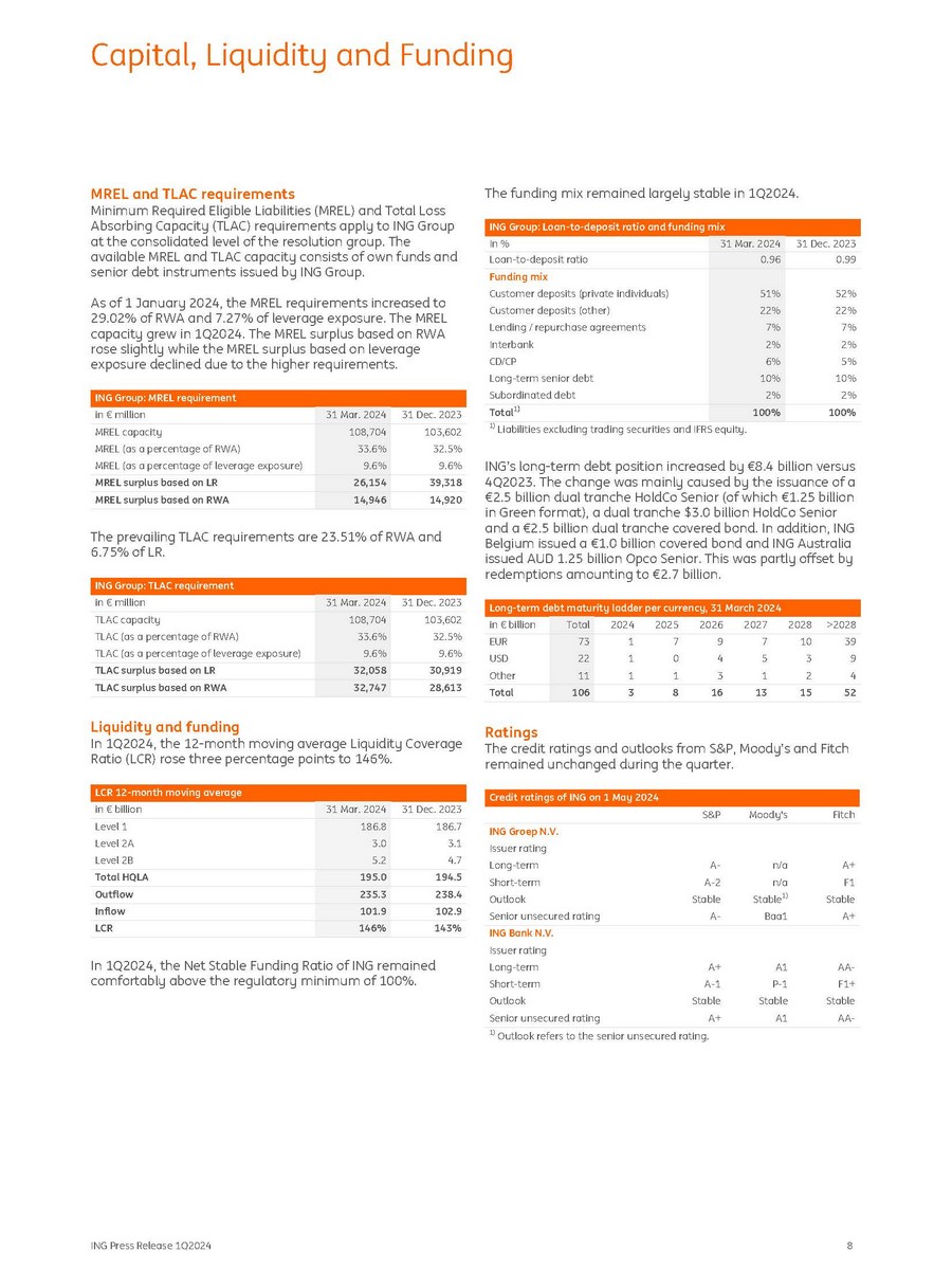 The available MREL and TLAC capacity consists of own funds and senior debt instruments issued by ING Group. As of 1 January 2024, the MREL requirements increased to 29.02% of RWA and 7.27% of leverage exposure. The MREL capacity grew in 1Q2024. The MREL surplus based on RWA rose slightly while the MREL surplus based on leverage exposure declined due to the higher requirements. ING Group: MREL requirement 31 Dec. 2023 31 Mar. 2024 in € million 103,602 108,704 MREL capacity 32.5% 33.6% MREL (as a percentage of RWA) 9.6% 9.6% MREL (as a percentage of leverage exposure) 39,318 26,154 MREL surplus based on LR 14,920 14,946 MREL surplus based on RWA The prevailing TLAC requirements are 23.51% of RWA and 6.75% of LR. ING Group: TLAC requirement 31 Dec. 2023 31 Mar. 2024 in € million 103,602 108,704 TLAC capacity 32.5% 33.6% TLAC (as a percentage of RWA) 9.6% 9.6% TLAC (as a percentage of leverage exposure) 30,919 32,058 TLAC surplus based on LR 28,613 32,747 TLAC surplus based on RWA Liquidity and funding In 1Q2024, the 12 - month moving average Liquidity Coverage Ratio (LCR) rose three percentage points to 146%. LCR 12 - month moving average 31 Dec. 2023 31 Mar. 2024 in € billion 186.7 186.8 Level 1 3.1 3.0 Level 2A 4.7 5.2 Level 2B 194.5 195.0 Total HQLA 238.4 235.3 Outflow 102.9 101.9 Inflow 143% 146% LCR In 1Q2024, the Net Stable Funding Ratio of ING remained comfortably above the regulatory minimum of 100%. The funding mix remained largely stable in 1Q2024. ING Group: Loan - to - deposit ratio and funding mix 31 Dec. 2023 31 Mar. 2024 In % 0.99 0.96 Loan - to - deposit ratio Funding mix 52% 51% Customer deposits (private individuals) 22% 22% Customer deposits (other) 7% 7% Lending / repurchase agreements 2% 2% Interbank 5% 6% CD/CP 10% 10% Long - term senior debt 2% 2% Subordinated debt 100% 100% Total 1) 1) Liabilities excluding trading securities and IFRS equity. ING’s long - term debt position increased by €8.4 billion versus 4Q2023. The change was mainly caused by the issuance of a €2.5 billion dual tranche HoldCo Senior (of which €1.25 billion in Green format), a dual tranche $3.0 billion HoldCo Senior and a €2.5 billion dual tranche covered bond. In addition, ING Belgium issued a €1.0 billion covered bond and ING Australia issued AUD 1.25 billion Opco Senior. This was partly offset by redemptions amounting to €2.7 billion. Long - term debt maturity ladder per currency, 31 March 2024 >2028 2028 2027 2026 2025 2024 Total in € billion 39 10 7 9 7 1 73 EUR 9 3 5 4 0 1 22 USD 4 2 1 3 1 1 11 Other 52 15 13 16 8 3 106 Total Ratings The credit ratings and outlooks from S&P, Moody’s and Fitch remained unchanged during the quarter. Credit ratings of ING on 1 May 2024 S&P Moody's Fitch ING Groep N.V. Issuer rating Long - term Short - term Outlook Senior unsecured rating A - A - 2 Stable A - n/a n/a Stable 1) Baa1 A+ F1 Stable A+ ING Bank N.V. Issuer rating Long - term Short - term Outlook Senior unsecured rating A+ A - 1 Stable A+ A1 P - 1 Stable A1 AA - F1+ Stable AA - 1) Outlook refers to the senior unsecured rating.