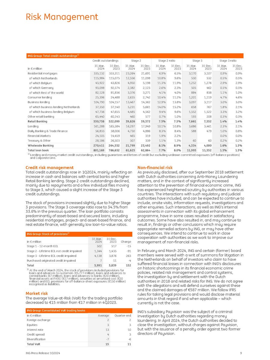 Capital, Liquidity and Funding ING Press Release 1Q2024 8 ING Press Release 1Q2024 9 ING Group: Total credit outstandings 1) Stage 3 ratio 31 Mar. 31 Dec. 2024 2023 Stage 3 31 Mar. 31 Dec. 2024 2023 Stage 2 ratio 31 Mar. 31 Dec. 2024 2023 Stage 2 31 Mar. 31 Dec. 2024 2023 Credit outstandings 31 Mar. 31 Dec. 2024 2023 in € million 0.9% 0.9% 3,107 3,170 6.5% 6.9% 21,691 23,264 333,311 335,132 Residential mortgages 0.5% 0.5% 532 530 9.6% 10.8% 11,098 12,556 115,075 115,984 of which Netherlands 2.9% 2.9% 1,276 1,252 11.9% 11.3% 5,198 4,950 43,826 43,922 of which Belgium 0.5% 0.5% 462 505 2.3% 2.6% 2,123 2,382 92,574 93,098 of which Germany 1.0% 1.1% 838 884 4.0% 4.1% 3,271 3,376 81,836 82,128 of which Rest of the world 4.6% 4.7% 1,119 1,201 11.2% 10.4% 2,742 2,635 24,488 25,396 Consumer lending 3.0% 3.0% 3,117 3,097 13.8% 12.9% 14,362 13,467 104,157 104,790 Business lending 2.1% 1.8% 767 658 15.2% 14.0% 5,661 5,231 37,140 37,350 of which business lending Netherlands 3.2% 3.3% 1,522 1,552 9.6% 9.4% 4,562 4,485 47,655 47,736 of which business lending Belgium 0.3% 0.3% 208 193 1.0% 0.7% 577 460 60,143 65,440 Other retail banking 1.4% 1.4% 7,552 7,661 7.5% 7.5% 39,372 39,826 522,099 530,758 Retail Banking 2.1% 0.8% 0.0% 0.2% 2.3% 1.0% 0.0% 0.2% 3,461 479 60 3,686 588 60 10.8% 8.4% 2.2% 1.3% 10.1% 8.3% 1.9% 1.1% 17,949 4,886 319 339 16,297 4,730 465 307 165,584 58,006 14,459 26,503 161,288 56,833 24,105 28,186 Lending Daily Banking & Trade Finance Financial Markets Treasury & Other 1.5% 1.6% 4,000 4,334 8.9% 8.1% 23,492 21,799 264,552 270,411 Wholesale Banking 1.5% 1.5% 11,552 11,995 8.0% 7.7% 62,864 61,625 786,652 801,169 Total loan book 1) Lending and money market credit outstandings, including guarantees and letters of credit but excluding undrawn committed exposures (off - balance positions) and Corporate Line. Credit risk management Total credit outstandings rose in 1Q2024, mainly reflecting an increase in cash and balances with central banks and higher Retail Banking lending. Stage 2 credit outstandings declined, mainly due to repayments and a few individual files moving to Stage 3, which caused a slight increase of the Stage 3 credit outstandings. The stock of provisions increased slightly due to higher Stage 3 provisions. The Stage 3 coverage ratio rose to 34.5% from 33.6% in the previous quarter. The loan portfolio consists predominantly of asset - based and secured loans, including residential mortgages, project - and asset - based finance, and real estate finance, with generally low loan - to - value ratios. ING Group: Stock of provisions 1) Change 31 Dec. 2023 31 Mar. 2024 in € million - 15 517 502 Stage 1 - 12 - month ECL - 91 1,435 1,344 Stage 2 - Lifetime ECL not credit impaired 263 3,876 4,138 Stage 3 - Lifetime ECL credit impaired - 4 11 7 Purchased originated credit impaired 152 5,839 5,991 Total 1) At the end of March 2024, the stock of provisions included provisions for loans and advances to customers (€5,777 million), loans and advances to central banks (€7 million), loans and advances to banks (€20 million), financial assets at FVOCI (€17 million), securities at amortised cost (€20 million) and ECL provisions for off - balance - sheet exposures (€150 million) recognised as liabilities. Market risk The average Value - at - Risk (VaR) for the trading portfolio decreased to €15 million from €17 million in 4Q2023. ING Group: Consolidated VaR trading books Quarter - end Average in € million 2 2 Foreign exchange 3 3 Equities 10 13 Interest rate 3 4 Credit spread - 6 - 7 Diversification 11 15 Total VaR Non - financial risk As previously disclosed, after our September 2018 settlement with Dutch authorities concerning Anti - Money Laundering matters, and in the context of significantly increased attention to the prevention of financial economic crime, ING has experienced heightened scrutiny by authorities in various countries. The interactions with such regulatory and judicial authorities have included, and can be expected to continue to include, onsite visits, information requests, investigations and other enquiries. Such interactions, as well as ING’s internal assessments in connection with its global enhancement programme, have in some cases resulted in satisfactory outcomes. Some have also resulted in, and may continue to result in, findings or other conclusions which may require appropriate remedial actions by ING, or may have other consequences. We intend to continue to work in close cooperation with authorities as we work to improve our management of non - financial risks. In February and March 2024, ING and certain (former) board members were served with a writ of summons for litigation in the Netherlands on behalf of investors who claim to have suffered financial losses in connection with ING’s disclosures on historic shortcomings in its financial economic crime policies, related risk management and control systems, the investigation by and settlement with the Dutch authorities in 2018 and related risks for ING. We do not agree with the allegations and will defend ourselves against these and the claimed damages of €587 million. We follow IFRS rules for taking legal provisions and would disclose material amounts in that regard if and when applicable – which currently is not the case. ING’s subsidiary Payvision was the subject of a criminal investigation by Dutch authorities regarding money laundering. In April 2024, the Dutch authorities decided to close the investigation, without charges against Payvision, but with the issuance of a penalty order against two former directors of Payvision.