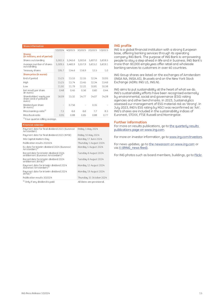 Segment Reporting: Corporate Line Share information 4Q2023 3Q2023 2Q2023 1Q2023 1Q2024 3,343.6 3,502.6 3,607.0 3,618.5 3,460.9 3,557.9 3,615.2 3,619.1 154.6 116.9 12.5 1.0 3,302.5 3,309.5 195.7 Shares (in millions, end of period) Shares outstanding Average number of shares outstanding Treasury shares 13.53 12.55 12.34 10.93 13.74 13.45 12.34 13.49 11.79 12.22 10.81 10.38 15.25 15.25 11.92 Share price (in euros) End of period High Low 0.45 0.56 0.60 0.44 15.32 14.77 14.07 14.28 0.756 - 0.35 - 6.6 6.6 7.7 8.3 0.88 0.85 0.88 0.77 0.48 16.09 - 7.3 0.95 Net result per share (in euros) Shareholders' equity per share (end of period in euros) Dividend per share (in euros) Price/earnings ratio 1) Price/book ratio 1) Four - quarter rolling average. Financial calendar Friday 3 May 2024 Payment date for final dividend 2023 (Euronext Amsterdam) Payment date for final dividend 2023 (NYSE) ING Capital Markets Day Publication results 2Q2024 Amsterdam) Ex - date for interim dividend 2024 (Euronext 1) Friday 10 May 2024 Monday 17 June 2024 Thursday 1 August 2024 Monday 5 August 2024 Record date for interim dividend 2024 entitlement (Euronext Amsterdam) 1) Tuesday 6 August 2024 Record date for interim dividend 2024 entitlement (NYSE) 1) Tuesday 6 August 2024 Payment date for interim dividend 2024 (Euronext Amsterdam) 1) Monday 12 August 2024 Payment date for interim dividend 2024 Monday 19 August 2024 (NYSE) 1) Publication results 3Q2024 Thursday 31 October 2024 1) Only if any dividend is paid All dates are provisional. ING profile ING is a global financial institution with a strong European base, offering banking services through its operating company ING Bank. The purpose of ING Bank is: empowering people to stay a step ahead in life and in business. ING Bank’s more than 60,000 employees offer retail and wholesale banking services to customers in over 40 countries. ING Group shares are listed on the exchanges of Amsterdam (INGA NA, INGA.AS), Brussels and on the New York Stock Exchange (ADRs: ING US, ING.N). ING aims to put sustainability at the heart of what we do. ING’s sustainability efforts have been recognised externally by environmental, social and governance (ESG) rating agencies and other benchmarks. In 2023, Sustainalytics assessed our management of ESG material risk as ‘strong’. In July 2023, ING's ESG rating by MSCI was reconfirmed as 'AA'. ING’s shares are included in the sustainability indices of Euronext, STOXX, FTSE Russell and Morningstar. ING Press Release 1Q2024 15 Further information For more on results publications, go to the quarterly results publications page on www.ing.com . For more on investor information, go to www.ing.com/investors . For news updates, go to the newsroom on www.ing.com or via X (@ING_news feed) . For ING photos such as board members, buildings, go to Flickr .