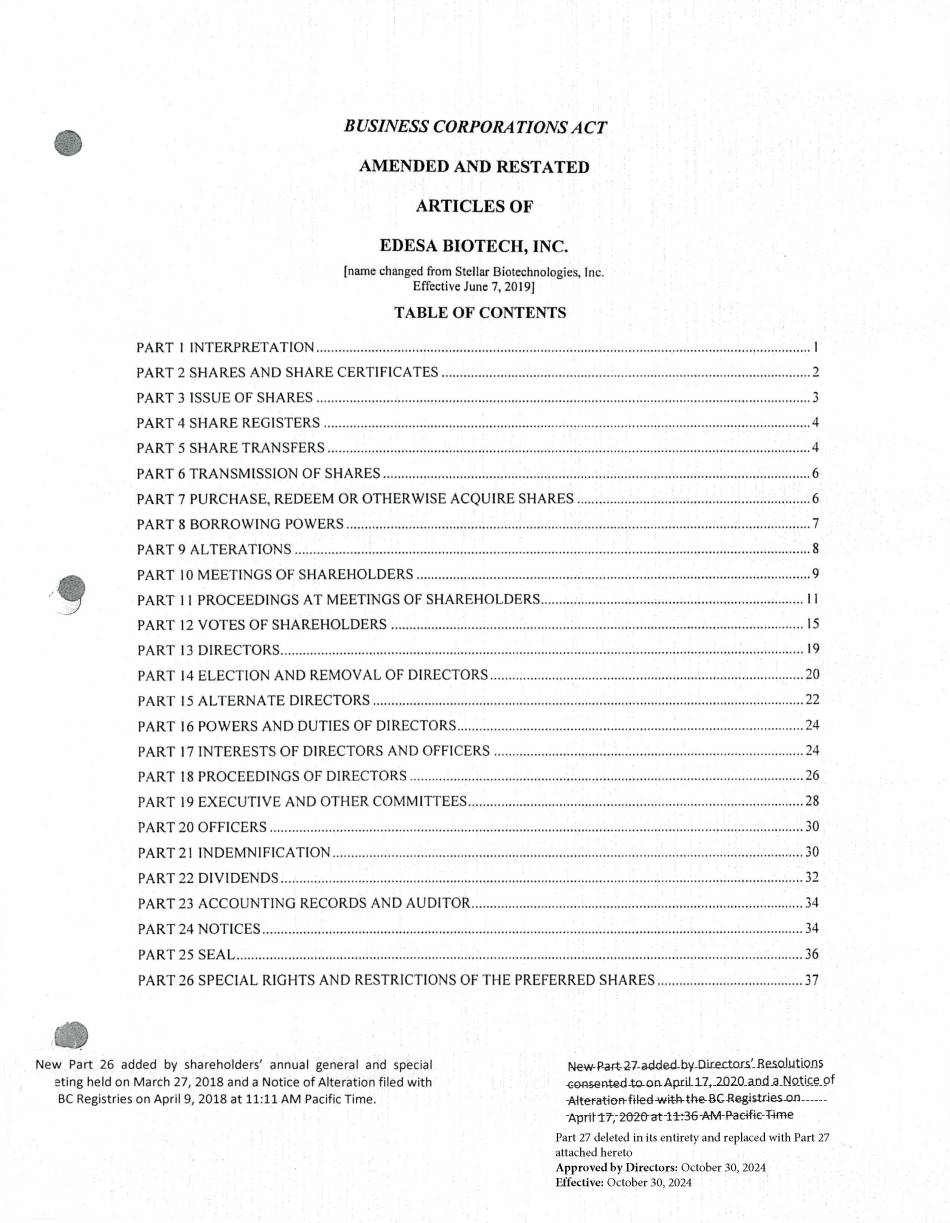 BUSINESS CORPORATIONS ACT AMENDED AND RESTATED ARTICLES OF EDESA BIOTECH, INC. [name changed from Stellar Biotechnologies , Inc. Effective June 7 , 2019) TABLE OF CONTENTS PART I INTERPRETATION . . ...... .. .. . . ..... . ... ...... . . . ......... .. ....... ...... ....... .. . . .. .. ...... . .. . ... . ..... . .. .. ..... .... .. . ....... . ......... ... ... . ... . I PART 2 SHARES AND SHARE CERTIFICATES ............... . .. .. ....... . . . .......... ....... . .. . . .. .... ... ....... ... ..... . ....... .. . . ....... .. ... . 2 PART 3 ISSUE OF SHARES . . ................ . ............... . ..... .... ....... .. ........... . . . . . . .... . .. . .... . .. .... . . . .. . . ... ... ... . .... . .. .. ... .. .. . .... . ....... 3 PART 4 SHARE REGISTERS ..... .. ... .. . .. . . . .. . . ....... . .............. . . . .. ... ................. .. ...................... . ...... . .... .... ..... ...... .. . . .. . . .. . . . 4 PART 5 SHARE TRANSFERS .. . .............. . ............. . ...... ..... .... .. .. . .. .. . . ...... . ............... .. ..... . ..... . ................. . .. .. ....... . . . . . .. . . 4 PART 6 TRANSMISSION OF SHARES . .... . ..... ...... . ........ ... ........... . . ..... .. ... .... . ... . ... ... .. . ....... . . . ... . . ..................... . .... .. . . .. 6 PART 7 PURCHASE , REDE E M OR OTHERWISE ACQUIRE SHARES ............ .... . . . .. . .... . ....... . .. . .... . ......... . ........... 6 PART 8 BORROWING POWERS .. . . ... .. . ........... . .. .. ...... . ..... . . ..... ........... . ....... ....... . .... .. ....... . ............. . . .. . ..... ... ... . .. . . .. . . .. . 7 PART 9 ALTERATIONS ..... . . . ...................... . .. .. . ...... . ....... . ..... .. .. ........ . .......... . ... ....... .. .......... . . . . ...... . .. . ... .... . .. . .............. 8 PART IO MEETINGS OF SHAREHOLDERS . .. .. . .. . .. . . .......... . ... ................. . ... ..... ... . ......... .. ......... . ... ...... ... . . .. .... . .... . .. . . 9 PART 11 PROC EE DINGS AT MEETINGS OF SHAREHOLDERS . . ... .... . . ............. ... ................... .. .... . ..... . . . . . . .. . ... . . 11 PART 12 VOTES OF SHAREHOLDERS . . ............ . ... ... . . . .... . ......... . . ............. . .. . . ..... .. ... .. ... .. . . . . ... . . ... . . .. ... . . . . ...... .. . .. . ... 15 PART 13 DIRECTORS .... . . . . .... . .. . ... .. ..... . ...... .... . ... . . . ... .. . .. .. ... ...... .. . .... .. . . . ..... . . . . . ... . .... ....... .. . ....... . .. ... .. .. ........ . ... . . . . .. ... .. 19 PART 14 ELECTION AND REMOVAL OF DIRECTORS . ... . .. . . .. .. ... . . . ..... . . . .. .. . ... ..... . ... . .. . .......... .. . ... . .. .... ..... .. . ..... . . 20 PART 15 ALTERNATE DIRECTORS . . .. . ...... . ........ .. .. . .. .. . . . .. ....... . . . ..... ... ................... . ... . .... ......... ...... .. . .... . .. .... ....... .. 22 PART 16 POWERS AND DUTIES OF DIRECTORS . .... ... ...... . .. .... .... ..... . ...... . ......... . ..... .... .. .. . . . ... . ... . ... .... . .. ... ...... ... . 24 PART 17 INTERESTS OF DIRECTORS AND OFFICERS . .. .... . ..... . ... . . . . . .. . ...... . . . .. . ..... . ........ . .. ......... .. ... . ... .... . . ... . .. . 24 PART 18 PROCEEDINGS OF DIRECTORS ... . .. ... . ... .. . .. . .... .... . . . . . . ... .... . ... . . .... .. . . . .. .. . ..... . ... . .. . ..... .. ...... . .. . . .. ...... .. . . . .... 26 PART 19 EXECUTIVE AND OTHER COMMITTEES .... ... ... ..... ..... .. .. . ................. .... . . ......... . . .. . .......... .. ......... . .. .. . ... 28 PART 20 OFFICERS . ..... .. . .. . . ... . .. .. ....... .. .. . .. ... . . .. ... . .......... ...... ... . . . .. . .. . .. . .. . . .. . . ................ . .. ... .. . . . ...... .. .... .. .. ................. . 30 PART 21 INDEMNIFICATION . .... ... .... . . ...... .. . ..... .. .......... . ... . .. .. . ........... ........... ........................ .... ..... . . .. . . .. . . ...... . . . ... .. 30 PART 22 DIVIDENDS .. . . ........ .. . . .. . . .. ...... .. . . .......... ..... .. ... .. . ... . ....... . ... . ... ........... . . .. . . ... ............... .... .. . . . . .. . .. . . . ....... .. ....... 32 PART 23 ACCOUNTING RECORDS AND AUDITOR .. . ..... .. ..... . ... ...... . ..... ...... . ......... . . .... ..... . .. . . . ........... . ........ ....... 34 PART 24 NOTICES . ... .. . .. .. . ... ... . . .. ... ........ .. . ....... .. .... . . ..... . .. . ... . . .. . .. ...... . .. . . . . . . . . ...... . . ...... . .. . .... .. .. ... . .. ... . . ...... . . . .. .. . ..... . . ... 34 PART 25 SEAL . ... . ... . . . . .. . . ...... .. ... .. . ..... . . ... ..... . .................... .. . .. . ........ . .. ..... .. ..... .... ........ . . ........ . . .. ................ ............... . .. 36 PART 26 SPECIAL RIGHTS AND RESTRICTIONS OF THE PREFERRED SHARES .... . ... .. .... ........ . . .. ...... .... .... 37 I ......J New Part 26 added by shareholders' annual general and special meeting held on March 27 , 2018 and a Notice of Alteration filed with the BC Registries on April 9 , 2018 at 11 : 11 AM Pacific Time . LEGAL_24557073 . 1 LEGAL_245570 7 3 . 1 BUSINESS CORPORATIONS ACT ARTICLES OF EDESA BIOTECH, INC. (the "Company") Number : C0867 l 78 PART 1 INTERPRETATION Definitions I. I In these Articles , unless the context otherwise requires: (a) " Act " means the Business Corporations Act (British Columbia) from time to time in force and all amendments thereto and includes all regulations and amendments thereto made pursuant to that Act ; (b) " board of directors ", " directors " and " board " mean the directors or sole director of the Company for the time being ; (c) " Interpretation Act " means the Interpretation Act (British Columbia) from time to time in force and all amendments thereto and includes all regulations and amendments thereto made pursuant to that Act ; (d) "