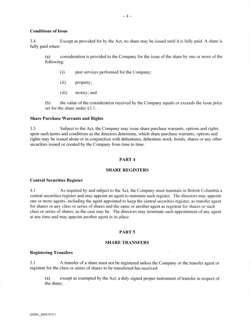 L EGAL _24557073 . 1 - 4 - Conditions of Issue 4. Exce pt as pro v id e d fo r b y th e Ac t , n o s h a r e m ay b e i ss u e d until it i s full y p a id . A s h a r e i s full y paid wh e n : (a) c o n s id e rati o n i s pro v id e d t o t h e Co mp a n y fo r th e i ss u e of th e s har e b y o n e o r m o r e o f t h e fo ll ow in g : (i) p as t se r v i ces p e r fo rm e d fo r th e Co mp a n y; (ii) p ro p e 1 ty; (iii) m o n ey; a nd (b) th e valu e o f th e c on s id e rati o n r ece i ve d b y th e Co mp a n y e qu a l s o r excee d s th e i ss u e pri ce se t fo r th e s h a r e und e r † 3 . I . Share Purchase Warrants and Rights 5. S ubj ec t t o th e Ac t , th e Co mp a n y m ay i ss u e s h a r e purch ase wa rrant s, o pti o n s a nd ri g ht s up o n s uch term s a nd co nditi o n s as th e dir e ct o r s d e t e rmin e, w hi c h s h a r e pu rc h ase wa rrant s , o pti o n s a nd ri g ht s m ay b e i ss u e d a l o n e o r in co njun c ti o n w ith d e b e ntur es , d e b e ntur e s t oc k , b o nd s , s h a r es o r a n y o th e r sec uriti es i ss u e d o r c r ea t e d b y t h e Co mp a n y fr o m tim e t o tim e . PART4 SHARE REGISTERS Central S e curities Re g ister 4. 1 As r e quir e d b y a nd s ubj ec t t o t h e Ac t , th e Co mp a n y mu s t m a int a in in Briti h Co lumbi a a ce nt ra l sec uriti es r eg i ste r a nd m ay a pp o in t a n age nt t o m a int a in s u c h r eg i ste r. T h e dir ec t o r s m ay a pp o in t o n e o r m o r e age nt s, in c ludin g th e age nt a pp o int e d t o k ee p th e ce nt ra l sec uriti es r eg i s t e r , as t ran sfe r age nt fo r s h a r es o r a n y c l ass o r se ri es of s h a r es a nd th e sa m e o r an o th e r age nt as r eg i s trar fo r s h a r es o r s u c h c l ass o r se ri es o f s h a r es , as th e case m ay b e. Th e dir ec t o r s m ay t e rmin a t e s u c h a pp o intm e nt o f a n y age nt at a n y tim e a nd m ay a pp o int a n o th e r age nt in it s pl ace. PARTS SHARE TRANSFERS Registering Tran s fer s 1.