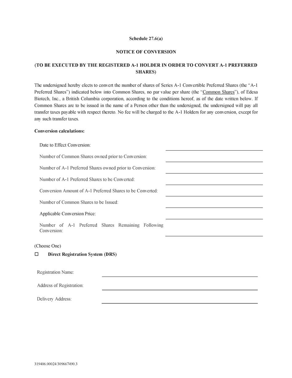 EDESA BIOTECH, INC. (the "Company") THE FOLLOWING IS AN EXTRACT OF DIRECTORS' SEP ARATE RESOLUTIONS CONSENTED TO IN WRITING ON APRIL 17 , 2020 EFFECTIVE AS OF APRIL 17, 2020 RESOLVED THAT R ESOLVE D : the a u t h orized s h are st ru c tur e of the Co mp a n y b e amended to create a se ri es of Preferred s h a r es , w ith o ut par va lu e , d es i g n e d w ith a n id e nti fy in g n ame of " Se rie s A - 1 Co n ve rtibl e Preferred s h a r es ", w ith the ma x imum numb e r of Se ri es A - I Co n vert ibl e Preferred s h a r es w hi c h the Co mp a n y i s a uth o ri ze d t o i ss u e b e set at 250 , in accor d a nc e w ith the p rov i s i o n s of the Business Corporations Act (Br iti s h Co lumbia ) (t h e "Ac t " ), a nd pursuant to a uth o ri ty ex pre ss l y vested in it by the provisions of th e Articles, ; RESOLVED: the exist in g Ar ti c l es be altered b y c r eat in g a nd attac hin g s p ec ial rights an d re s tri ct ion s to the Se ri es A - I Co n ver tibl e Pr efe rred S hare s as Part 27 of the Articles, as set out in Sc h e dule " A" . ; RESOLVED: the a lt eratio n s m ade to the Co mp a n y's a uth o ri ze d s har e st ructur e and Articles s hall n o t take effect until the Compa n y ' s Notice of A rti c l es i s a lt ere d t o r eflect s u c h alterations to th e a uth o ri ze d s h are s tru ct ur e a nd Art i c l es of the Compa n y ; RESOLVED: th e Notice of A rticl es of the Co mpan y b e a lt ere d to r e flect the alterations to the a uth o ri ze d s har e str u ct ur e a nd Articles of the Co mp a n y a ppro ve d h e r e in b y filin g a Notice of Alteration w ith the R eg i st r a r of Co mp a ni es ; RESOLYEO: a n y Prop e r Officer is , a nd the age n ts of the Co mp a n y a r e, h e r e b y a uthori ze d and dir ecte d fo r a nd o n b e h a l f of the Co mp a n y to exec ut e and d e li ver, und e r co rp orate sea l of th e Co mp a n y o r otherwise, the Notice of Alteration a nd a ll s uch other d oc um en ts and in str um en t s a nd to d o a ll s uch ot h e r acts a nd thin gs as in hi s o r h e r o pini o n ma y b e nec essary o r de s irable to g i ve full effec t to th e a bov e r eso lution s ; R ESOLVE D : the Co mp a n y h ere b y a pp o int s Fasken Martineau DuM o ulin LLP to act as it s age nt for filin g the N ot ic e of Alteration to the Notice of A rti c l es , which Notic e of Alteration to the Notice of Articles s h a ll r e fl ec t the alteration to th e authorized s h a r e s tructure and t o th e s p ec i a l ri g ht s and r est ri ct i o ns in the Articles authorized her e in ; RESOLVED: the for m of s h a r e certificate for the Se ri es A - I Co n verti bl e Pr eferre d S h a r es , w hich i s a nn exe d h e r eto as Sc h edu l e " B ", b e and the sa m e i s h e reb y a ppro ve d , and adopted. 3 1 9 4 06 . 0000 5 /l 0 7 87 11 92 . 1 Part 27 deleted in its entirety and replaced with Part 27 attached hereto Approved by Directors: October 30, 2024 Effective: October 30, 2024