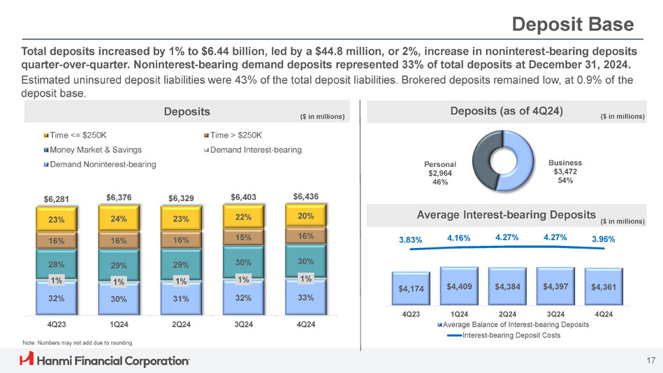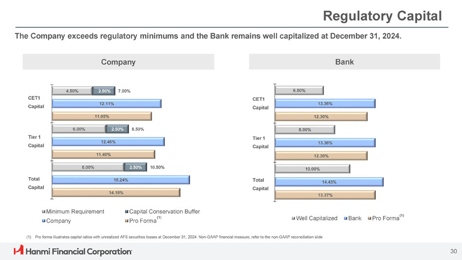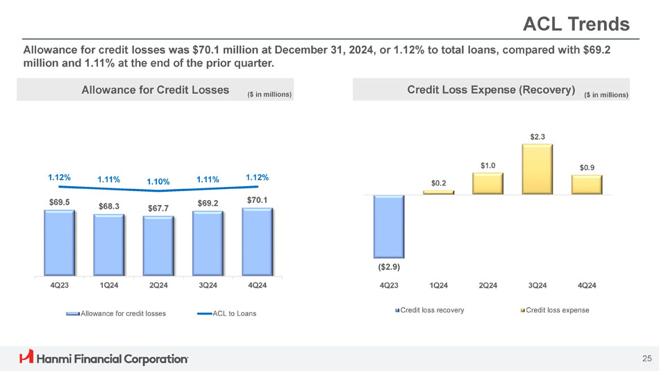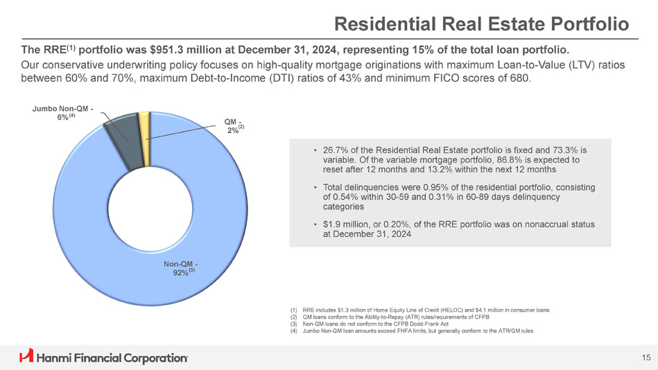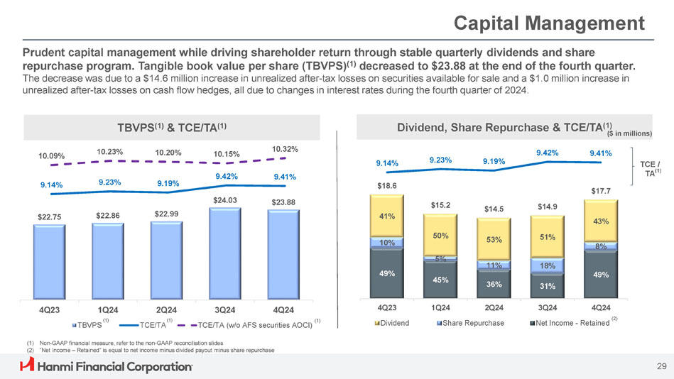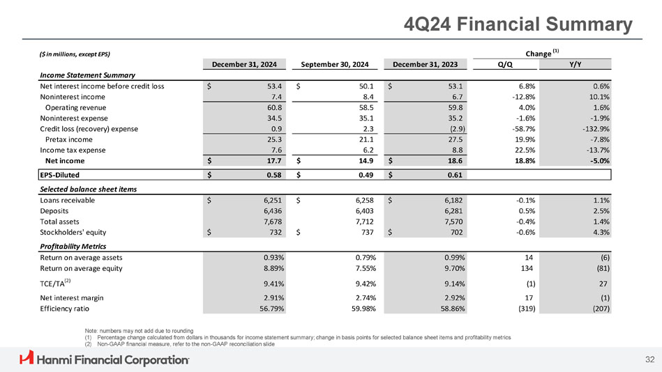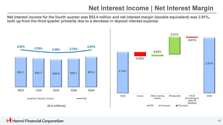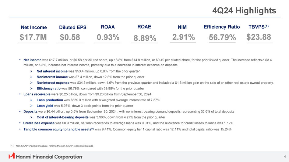 ボニー・リー社長兼最高経営責任者(CEO)は次のように述べています。「Hanmi は第 4 四半期に卓越した業績を達成し、今年最高の四半期業績を達成し、2024 年を力強いモメンタムで締めくくることができました。「当チームの卓越した実行力により、純金利マージンは17ベーシス・ポイント拡大し2.91%となり、規律ある経費管理、慎重な与信管理に支えられ、大幅な増益となりました。こうした堅調な業績は、当行のリレーションシップ重視のバンキング・モデルの強さを浮き彫りにしています。"