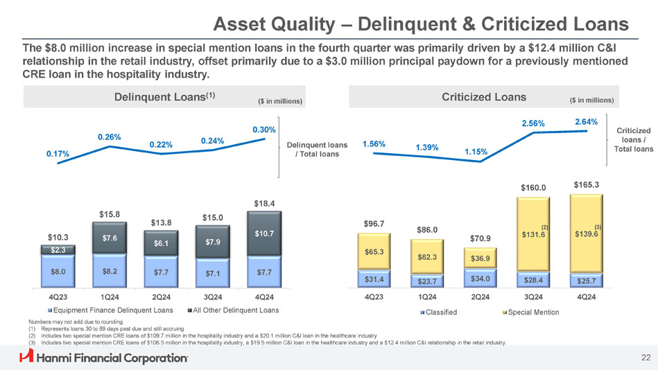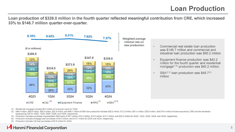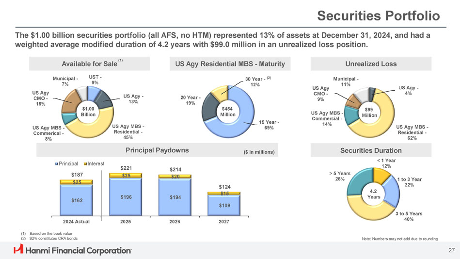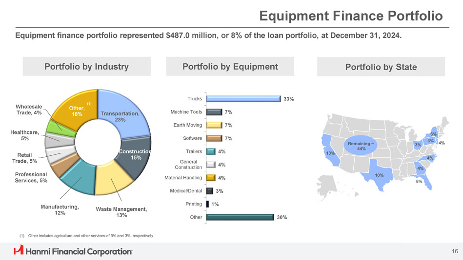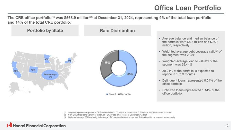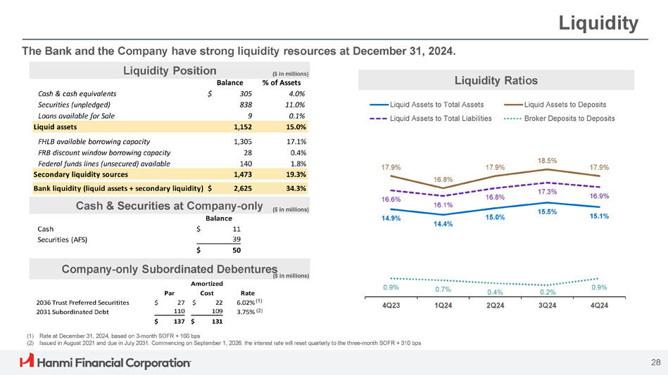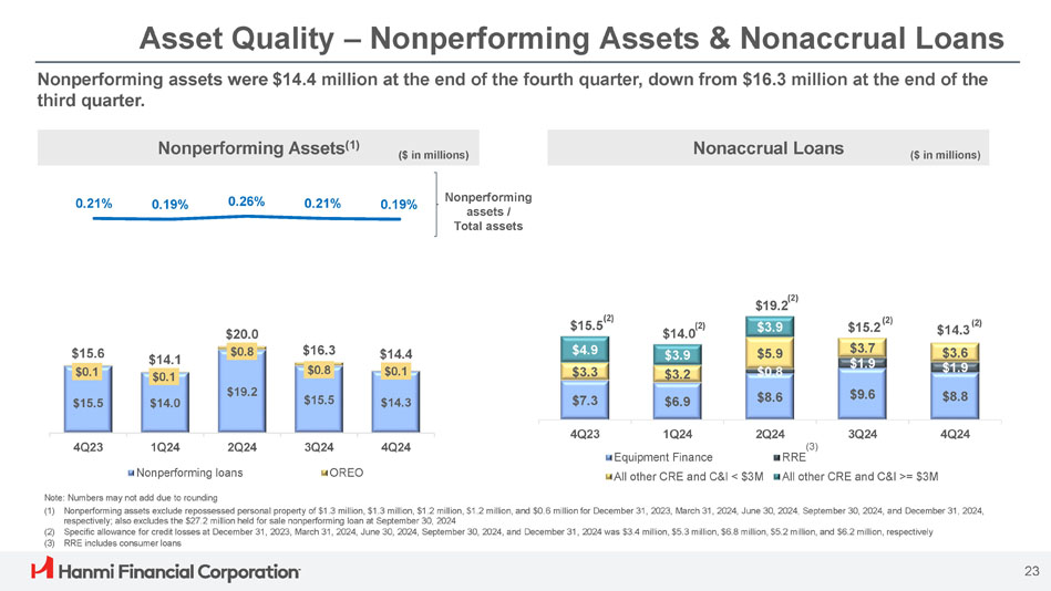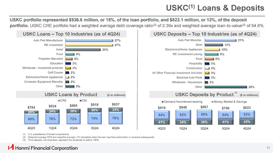 ボニー・リー社長兼最高経営責任者(CEO)は次のように述べています。「Hanmi は第 4 四半期に卓越した業績を達成し、今年最高の四半期業績を達成し、2024 年を力強いモメンタムで締めくくることができました。「当チームの卓越した実行力により、純金利マージンは17ベーシス・ポイント拡大し2.91%となり、規律ある経費管理、慎重な与信管理に支えられ、大幅な増益となりました。こうした堅調な業績は、当行のリレーションシップ重視のバンキング・モデルの強さを浮き彫りにしています。"