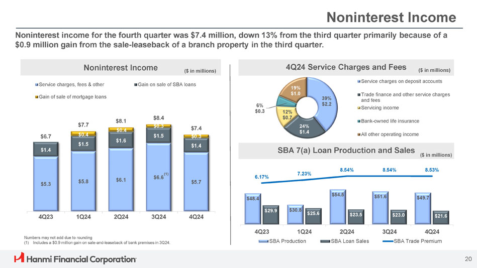 非金利収入は、2023年の3,420万ドルから260万ドル(7.6%)減少して3,160万ドルとなったが、これは主に2023年の支店不動産のセール・アンド・リースバックによる利益400万ドルと預金サービス手数料の0.8百万ドルの減少によるものである。これらの項目は、住宅ローン売却益150万ドルおよび2024年の支店不動産のセール・アンド・リースバックによる利益0.9百万ドルで一部相殺された。2024年に販売されたSBAローンの量は、2023年の1億50万ドルから9,370万ドルに減少したが、売買プレミアムは2023年の7.12%から2024年には8.18%に増加した。