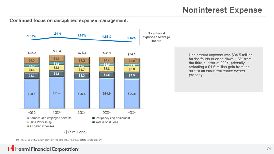 第 4 四半期の非金利費用は、前年同期の 3,510 万ドルから 0.6 百万ドル減少し、3,450 万ドルとなった。この減少は主に、その他保有不動産の売却益160万ドルを反映しています。この利益を除くと、第 4 四半期の非金利費用は、広告宣伝費および回収・事業活動に伴う弁護士費用の増加により、前四半期比 3.1%増加しました。さらに、第 4 四半期のその他の営業費用には、以前の買収で取得した SBA ローンに関連する費用 5 百万ドルが含まれ、第 3 四半期には固定資産税の払い戻し費用 3 百万ドルが含まれました。第4四半期の効率率は56.8%であった(2024年第3四半期は60.0%)。