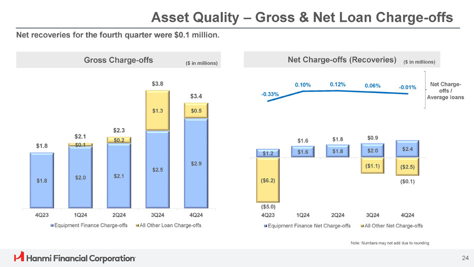 第 4 四半期の信用損失費用は、2024 年第 3 四半期の 230 万ドルに対し、0.9 百万ドルであった。第 4 四半期の貸倒費用には、0.9 百万ドルの貸倒損失が含まれています。第 4 四半期の正味貸出金回収額は、第 3 四半期の正味貸出金償却額が 0.9 百万ドルであったのに対し、0.1 百万ドルでした。
