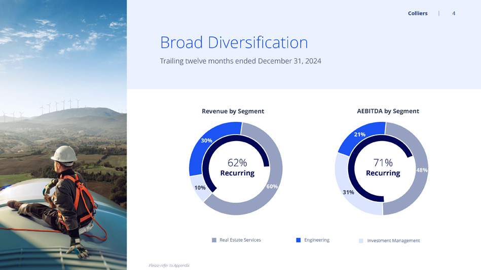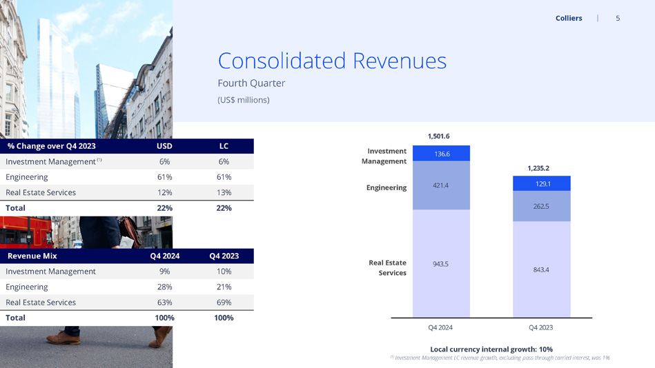 Colliers 3 (US $ millions, except per share amounts) Highlights • Robust revenue growth • Strengthened momentum across all business segments • Accelerating rebound in Capital Markets • Completed four Engineering tuck - in acquisitions during the quarter • Expecting growth in 2025 both internally and from completed acquisitions USD LC (1) Revenue 1,501.6 1,235.2 22% 22% Adjusted EBITDA 225.3 198.4 14% 15% Adjusted EBITDA Margin 15.0% 16.1% Adjusted EPS 2.26 2.00 13% GAAP Operating Earnings 121.4 132.6 -8% GAAP Operating Earnings Margin 8.1% 10.7% GAAP diluted EPS 1.47 1.42 4% USD LC (1) Revenue 4,822.0 4,335.1 11% 11% Adjusted EBITDA 644.2 595.0 8% 9% Adjusted EBITDA Margin 13.4% 13.7% Adjusted EPS 5.75 5.35 7% GAAP Operating Earnings 389.2 300.9 29% GAAP Operating Earnings Margin 8.1% 6.9% GAAP diluted EPS 3.22 1.41 128% Three months ended December 31 2024 2023 %Change Twelve months ended December 31 2024 2023 % Change (1) Local Currency 30% 60% 10% 21% 48% 31% Please refer to Appendix Colliers 4 Trailing twelve months ended December 31, 2024 Broad Diversification Real Estate Services Investment Management Engineering 71% Recurring Revenue by Segment AEBITDA by Segment 62% Recurring