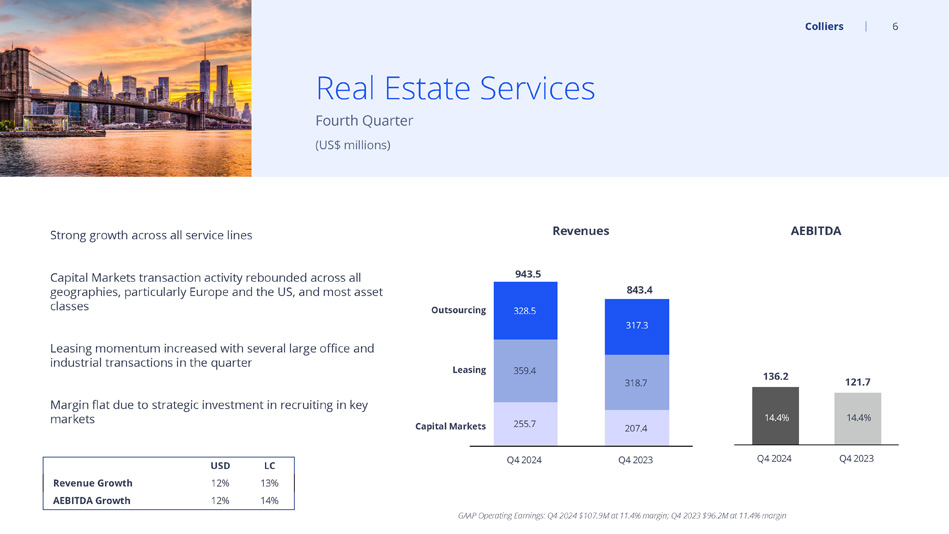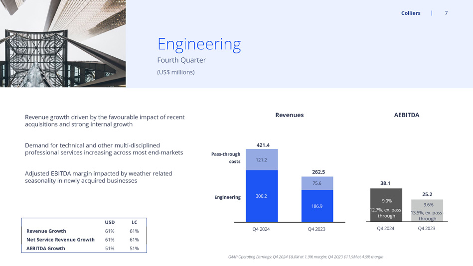 Colliers 5 Fourth Quarter (US$ millions) Consolidated Revenues % Change over Q4 2023 USD LC Investment Management (1) 6% 6% Engineering 61% 61% Real Estate Services 12% 13% Total 22% 22% Revenue Mix Q4 2024 Q4 2023 Investment Management 9% 10% Engineering 28% 21% Real Estate Services 63% 69% Total 100% 100% 4 4 Engineering Investment Management Real Estate Services Local currency internal growth: 10% (1) Investment Management LC revenue growth, excluding pass - through carried interest, was 1% 4 4 Colliers 6 Fourth Quarter (US$ millions) Real Estate Services GAAP Operating Earnings: Q4 2024 $107.9M at 11.4% margin; Q4 2023 $96.2M at 11.4% margin Strong growth across all service lines Capital Markets transaction activity rebounded across all geographies, particularly Europe and the US, and most asset classes Leasing momentum increased with several large office and industrial transactions in the quarter Margin flat due to strategic investment in recruiting in key markets USD LC Revenue Growth 12% 13% AEBITDA Growth 12% 14% Revenues AEBITDA Outsourcing Leasing Capital Markets