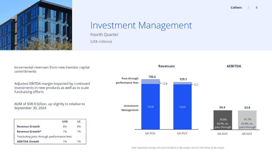 Colliers 7 Fourth Quarter (US$ millions) Engineering GAAP Operating Earnings: Q4 2024 $8.0M at 1.9% margin; Q4 2023 $11.9M at 4.5% margin Revenue growth driven by the favourable impact of recent acquisitions and strong internal growth Demand for technical and other multi - disciplined professional services increasing across most end - markets Adjusted EBITDA margin impacted by weather related seasonality in newly acquired businesses 4 4 USD LC Revenue Growth 61% 61% Net Service Revenue Growth 61% 61% AEBITDA Growth 51% 51% Revenues AEBITDA Engineering Pass - through costs Colliers 8 Fourth Quarter (US$ millions) Investment Management GAAP Operating Earnings: Q4 2024 $38.0M at 27.8% margin; Q4 2023 $41.5M at 32.2% margin Incremental revenues from new investor capital commitments Adjusted EBITDA margin impacted by continued investments in new products as well as to scale fundraising efforts AUM of $98.9 billion, up slightly to relative to September 30, 2024 Revenues AEBITDA 4 4 Investment Management USD LC Revenue Growth 6% 6% Revenue Growth* 1% 1% *excluding pass-through performance fees AEBITDA Growth 1% 1% Pass - through performance fees