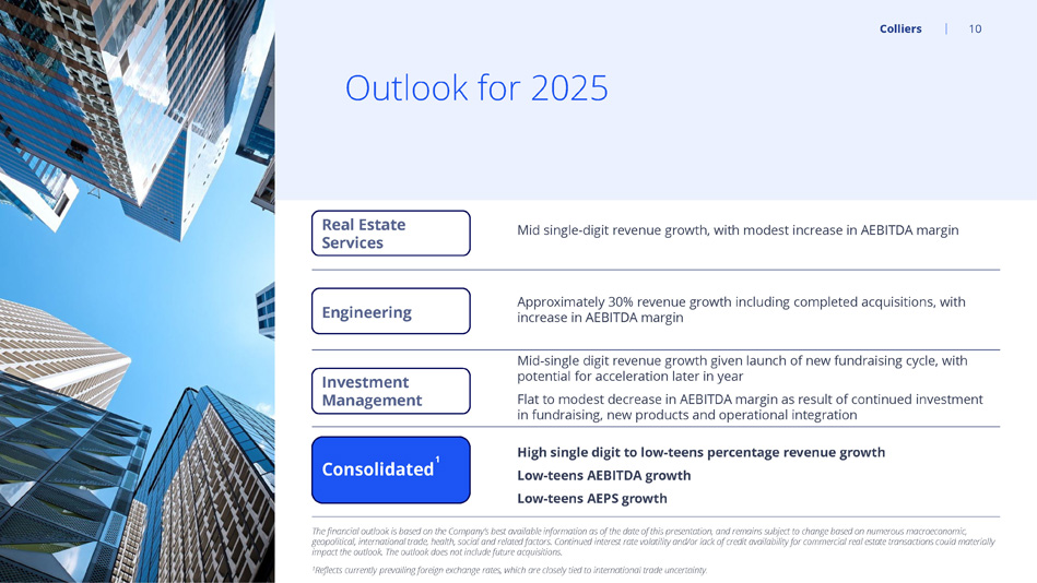 • Leverage ratio declined to 2.0x on strong free cash flow • More than $1.2 billion of available liquidity under expanded and extended revolving credit facility • Anticipating capital expenditures of $100 - $115 million in 2025 Colliers 9 (US$ millions) Capitalization & Capital Allocation Cash $ 176.3 $ 181.1 Total Debt 1,508.5 1,502.6 Net Debt $ 1,332.2 $ 1,321.5 Redeemable non-controlling interests 1,152.6 1,072.1 Shareholders' equity 1,325.6 850.5 Total capitalization $ 3,810.4 $ 3,244.1 Net debt / pro forma adjusted EBITDA - Leverage Ratio (1) 2.0x 2.2x Capital Expenditures $ 65.1 $ 84.5 Acquisition Spend (2) $ 542.3 $ 152.1 Twelve months ended December 31, 2024 December 31, 2023 December 31, 2024 December 31, 2023 (1) Net debt for financial leverage ratio excludes restricted cash and warehouse credit facilities, in accordance with debt a gre ements (2) Includes business acquisitions, contingent acquisition consideration and purchases of non - controlling interests in subsidiar ies Colliers 10 The financial outlook is based on the Company’s best available information as of the date of this presentation, and remains s ubj ect to change based on numerous macroeconomic, geopolitical, international trade, health, social and related factors.