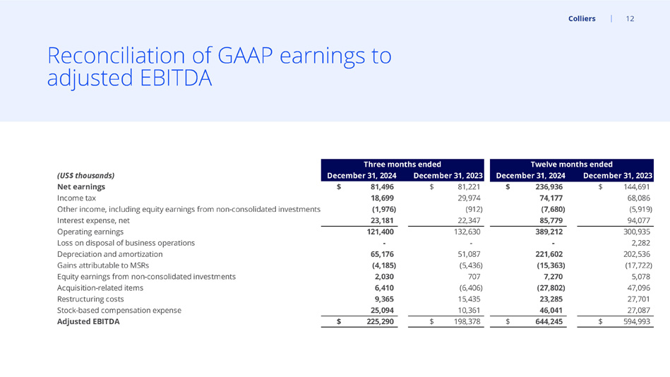Colliers 12 Reconciliation of GAAP earnings to adjusted EBITDA (US$ thousands) Net earnings $ 81,496 $ 81,221 $ 236,936 $ 144,691 Income tax 18,699 29,974 74,177 68,086 Other income, including equity earnings from non-consolidated investments (1,976) (912) (7,680) (5,919) Interest expense, net 23,181 22,347 85,779 94,077 Operating earnings 121,400 132,630 389,212 300,935 Loss on disposal of business operations - - - 2,282 Depreciation and amortization 65,176 51,087 221,602 202,536 Gains attributable to MSRs (4,185) (5,436) (15,363) (17,722) Equity earnings from non-consolidated investments 2,030 707 7,270 5,078 Acquisition-related items 6,410 (6,406) (27,802) 47,096 Restructuring costs 9,365 15,435 23,285 27,701 Stock-based compensation expense 25,094 10,361 46,041 27,087 Adjusted EBITDA $ 225,290 $ 198,378 $ 644,245 $ 594,993 Three months ended Twelve months ended December 31, 2024 December 31, 2023 December 31, 2024 December 31, 2023 Colliers 13 Reconciliation of GAAP earnings to adjusted net earnings and adjusted earnings per share Amount shown for the year ended December 31, 2023, reflects the "if - converted" method's dilutive impact on the adjusted EPS calc ulation.