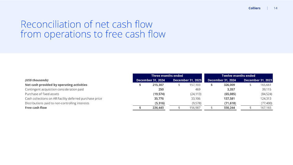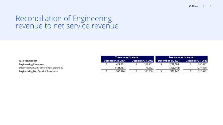 (US$ thousands) Net earnings $ 81,496 $ 81,221 $ 236,936 $ 144,691 Non-controlling interest share of earnings (18,894) (17,593) (53,968) (56,560) Interest on Convertible Notes - - - 2,861 Loss on disposal of operations - - - 2,282 Amortization of intangible assets 47,666 36,269 155,363 147,928 Gains attributable to MSRs (4,185) (5,436) (15,363) (17,722) Acquisition-related items 6,410 (6,406) (27,802) 47,096 Restructuring costs 9,365 15,435 23,285 27,701 Stock-based compensation expense 25,094 10,361 46,041 27,087 Income tax on adjustments (24,287) (13,313) (50,403) (48,359) Non-controlling interest on adjustments (7,409) (5,534) (25,740) (22,667) Adjusted net earnings $ 115,256 $ 95,004 $ 288,349 $ 254,338 (US$) Diluted net earnings per common share $ 1.47 $ 1.42 $ 3.22 $ 1.38 Interest on Convertible Notes, net of tax - - - 0.04 Non-controlling interest redemption increment (0.25) (0.08) 0.42 0.47 Loss on disposal of operations - - - 0.05 Amortization expense, net of tax 0.50 0.47 1.98 1.92 Gains attributable to MSRs, net of tax (0.05) (0.07) (0.17) (0.21) Acquisition-related items 0.08 (0.14) (0.75) 0.83 Restructuring costs, net of tax 0.14 0.24 0.35 0.43 Stock-based compensation expense, net of tax 0.37 0.16 0.70 0.44 Adjusted EPS $ 2.26 $ 2.00 $ 5.75 $ 5.35 Diluted weighted average shares for Adjusted EPS (thousands) 51,036 47,582 50,182 47,504 Three months ended Twelve months ended December 31, 2024 December 31, 2023 December 31, 2024 December 31, 2023 Three months ended Twelve months ended December 31, 2024 December 31, 2023 December 31, 2024 December 31, 2023 Colliers 14 Reconciliation of net cash flow from operations to free cash flow (US$ thousands) Net cash provided by operating activities $ 215,307 $ 157,103 $ 326,009 $ 165,661 Contingent acquisition consideration paid 250 469 3,357 39,115 Purchase of fixed assets (19,574) (24,113) (65,085) (84,524) Cash collections on AR Facility deferred purchase price 35,776 33,106 137,581 124,313 Distributions paid to non-controlling interests (5,316) (9,578) (71,618) (77,400) Free cash flow $ 226,443 $ 156,987 $ 330,244 $ 167,165 Three months ended Twelve months ended December 31, 2024 December 31, 2023 December 31, 2024 December 31, 2023