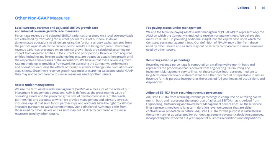Percentage revenue variances presented on an internal growth basis are calculated assuming no impact from acquired entities in the current and prior periods. Revenue from acquired entities, including any foreign exchange impacts, are treated as acquisition growth until the respective anniversaries of the acquisitions. We believe that these revenue growth rate methodologies provide a framework for assessing the Company’s performance and operations excluding the effects of foreign currency exchange rate fluctuations and acquisitions. Since these revenue growth rate measures are not calculated under GAAP, they may not be comparable to similar measures used by other issuers. Assets under management We use the term assets under management (“AUM”) as a measure of the scale of our Investment Management operations. AUM is defined as the gross market value of operating assets and the projected gross cost of development assets of the funds, partnerships and accounts to which we provide management and advisory services, including capital that such funds, partnerships and accounts have the right to call from investors pursuant to capital commitments. Our definition of AUM may differ from those used by other issuers and as such may not be directly comparable to similar measures used by other issuers. Fee paying assets under management We use the term fee paying assets under management (“FPAUM”) to represent only the AUM on which the Company is entitled to receive management fees. We believe this measure is useful in providing additional insight into the capital base upon which the Company earns management fees. Our definition of FPAUM may differ from those used by other issuers and as such may not be directly comparable to similar measures used by other issuers. Recurring revenue percentage Recurring revenue percentage is computed on a trailing twelve - month basis and represents the proportion that is derived from Engineering, Outsourcing and Investment Management service lines. All these service lines represent medium to long - term duration revenue streams that are either contractual or repeatable in nature. Revenue for this purpose incorporates the expected full year impact of acquisitions and dispositions. Adjusted EBITDA from recurring revenue percentage Adjusted EBITDA from recurring revenue percentage is computed on a trailing twelve - month basis and represents the proportion of adjusted EBITDA that is derived from Engineering, Outsourcing and Investment Management service lines. All these service lines represent medium to long - term duration revenue streams that are either contractual or repeatable in nature. Adjusted EBITDA for this purpose is calculated in the same manner as calculated for our debt agreement covenant calculation purposes, incorporating the expected full year impact of business acquisitions and dispositions. Colliers 16 Other Non - GAAP Measures Appendix Full Year Segment Details