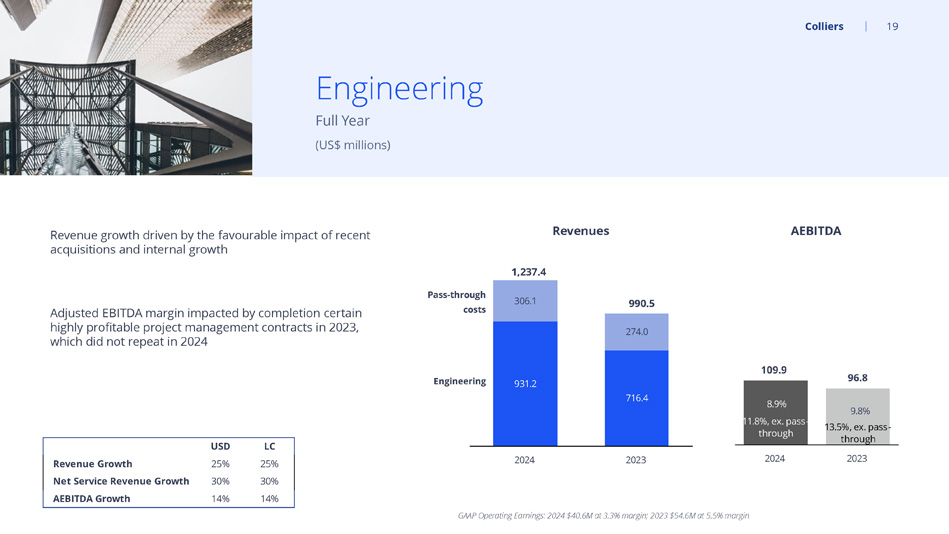 Colliers 18 Full Year (US$ millions) Real Estate Services GAAP Operating Earnings: 2024 $231.4M at 7.5% margin; 2023 $188.2M at 6.6% margin Solid growth across all service lines with transaction activity up Margin benefitted from service mix and operating leverage USD LC Revenue Growth 8% 8% AEBITDA Growth 14% 15% Revenues AEBITDA Outsourcing Leasing Capital Markets Colliers 19 Full Year (US$ millions) Engineering GAAP Operating Earnings: 2024 $40.6M at 3.3% margin; 2023 $54.6M at 5.5% margin Revenue growth driven by the favourable impact of recent acquisitions and internal growth Adjusted EBITDA margin impacted by completion certain highly profitable project management contracts in 2023, which did not repeat in 2024 USD LC Revenue Growth 25% 25% Net Service Revenue Growth 30% 30% AEBITDA Growth 14% 14% Revenues AEBITDA Engineering Pass - through costs