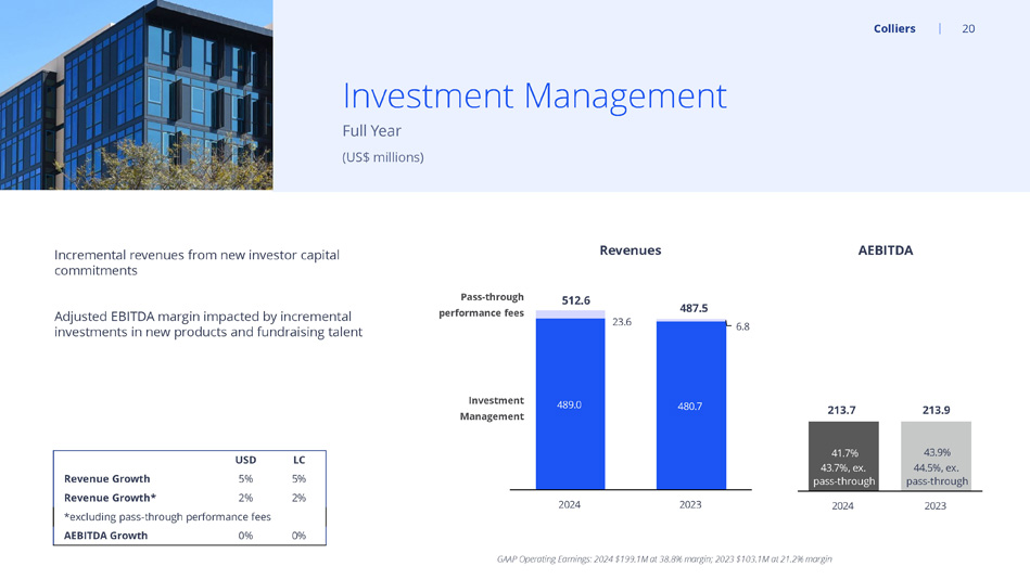 Colliers 20 Full Year (US$ millions) Investment Management GAAP Operating Earnings: 2024 $199.1M at 38.8% margin; 2023 $103.1M at 21.2% margin Incremental revenues from new investor capital commitments Adjusted EBITDA margin impacted by incremental investments in new products and fundraising talent Revenues AEBITDA Investment Management USD LC Revenue Growth 5% 5% Revenue Growth* 2% 2% *excluding pass-through performance fees AEBITDA Growth 0% 0% Pass - through performance fees