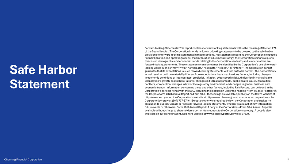 Chemung Financial Corporation Safe Harbor Statement Forward - looking Statements: This report contains forward - looking statements within the meaning of Section 27A of the Securities Act. The Corporation intends its forward - looking statements to be covered by the safe harbor provisions for forward - looking statements in these sections. All statements regarding the Corporation’s expected financial position and operating results, the Corporation’s business strategy, the Corporation’s financial plans, forecasted demographic and economic trends relating to the Corporation’s industry and similar matters are forward - looking statements. These statements can sometimes be identified by the Corporation’s use of forward - looking words such as “may,” “will,” “anticipate,” “estimate,” “expect,” or “intend.” The Corporation cannot guarantee that its expectations in such forward - looking statements will turn out to be correct. The Corporation’s actual results could be materially different from expectations because of various factors, including changes in economic conditions or interest rates, credit risk, inflation, cybersecurity risks, difficulties in managing the Corporation’s growth, recent bank failures, changes in FDIC assessments, public health issues, geopolitical conflicts, competition, changes in law or the regulatory environment, and changes in general business and economic trends. Information concerning these and other factors, including Risk Factors, can be found in the Corporation’s periodic filings with the SEC, including the discussion under the heading “Item 1A. Risk Factors” in the Corporation’s 2023 Annual Report on Form 10 - K. These filings are available publicly on the SEC’s website at http://www.sec.gov, on the Corporation’s website at http://www.chemungcanal.com or upon request from the Corporate Secretary at (607) 737 - 3746. Except as otherwise required by law, the Corporation undertakes no obligation to publicly update or revise its forward - looking statements, whether as a result of new information, future events or otherwise. Form 10 - K Annual Report: A copy of the Corporation’s Form 10 - K Annual Report is available without charge to shareholders upon written request to the Corporation’s secretary. A copy is also available on our Transfer Agent, Equiniti’s website at www.astproxyportal.com/ast/01079. 3 Chemung Financial Corporation Key Takeaways 4 2025 Raymond James Small Cap Investor Meetings Continued strength and momentum in underlying businesses High customer engagement across all business lines and geographies.