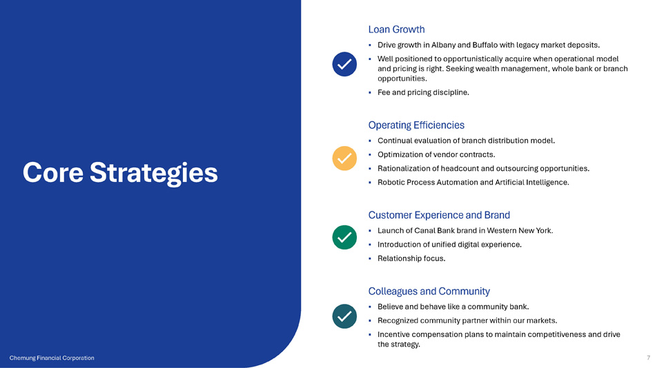 Chemung Financial Corporation Oldest locally owned and managed community bank in New York State, dating to 1833. Subsidiary bank - Chemung Canal Trust Company - operates with 30 branches over 14 counties in New York and Pennsylvania. Operating as Capital Bank in Albany, New York market and Canal Bank in Buffalo, New York market. Trust and Wealth Management division with $2.2 bn in assets under management or administration. New York chartered bank and member of the Federal Reserve Listed on NASDAQ Global Select (Ticker: CHMG) Market Capitalization of $232.9 million at December 31, 2024 About Us 6 History Operations Legal & Market 6 2025 Raymond James Small Cap Investor Meetings Chemung Financial Corporation Loan Growth ▪ Drive growth in Albany and Buffalo with legacy market deposits.