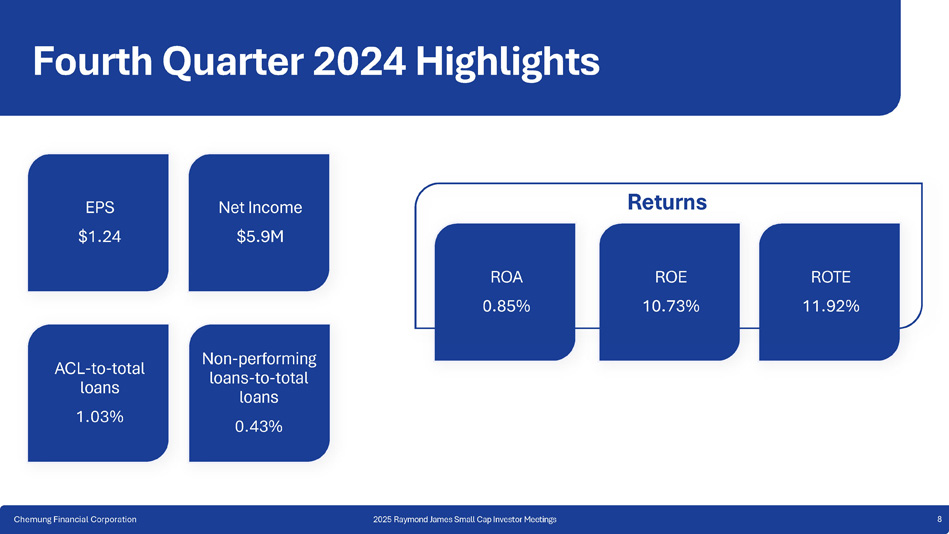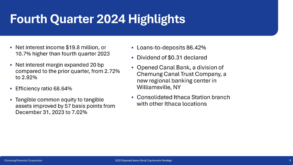 Core Strategies 7 Chemung Financial Corporation Fourth Quarter 2024 Highlights 8 EPS $1.24 Net Income $5.9M ROA 0.85% ROE 10.73% ROTE 11.92% ACL - to - total loans 1.03% Non - performing loans - to - total loans 0.43% Returns 8 2025 Raymond James Small Cap Investor Meetings Chemung Financial Corporation Fourth Quarter 2024 Highlights 9 ▪ Net interest income $19.8 million, or 10.7% higher than fourth quarter 2023 ▪ Net interest margin expanded 20 bp compared to the prior quarter, from 2.72% to 2.92% ▪ Efficiency ratio 68.64% ▪ Tangible common equity to tangible assets improved by 57 basis points from December 31, 2023 to 7.02% ▪ Loans - to - deposits 86.42% ▪ Dividend of $0.31 declared ▪ Opened Canal Bank, a division of Chemung Canal Trust Company, a new regional banking center in Williamsville, NY ▪ Consolidated Ithaca Station branch with other Ithaca locations 9 2025 Raymond James Small Cap Investor Meetings Chemung Financial Corporation Appendices 10 Company and Financial Highlights Background Page 11 Corporate Organization Markets and Share Management Team Community Loans Page 17 Loan Growth Portfolio Composition Commercial Portfolio Non - Performers Investments Page 29 Portfolio Composition Yield and Duration Fair Value and AOCI Deposits Page 33 Deposit Costs Deposits Composition Liquidity Performance Page 38 Net Income Trend Net Interest Margin Non - Interest Income Non - Interest Expense Expense Management Capital Management 2025 Raymond James Small Cap Investor Meetings