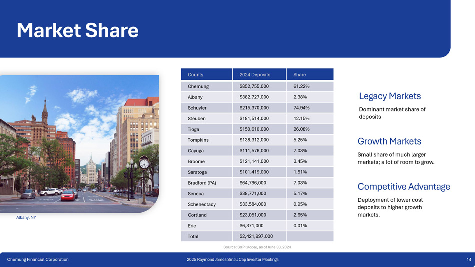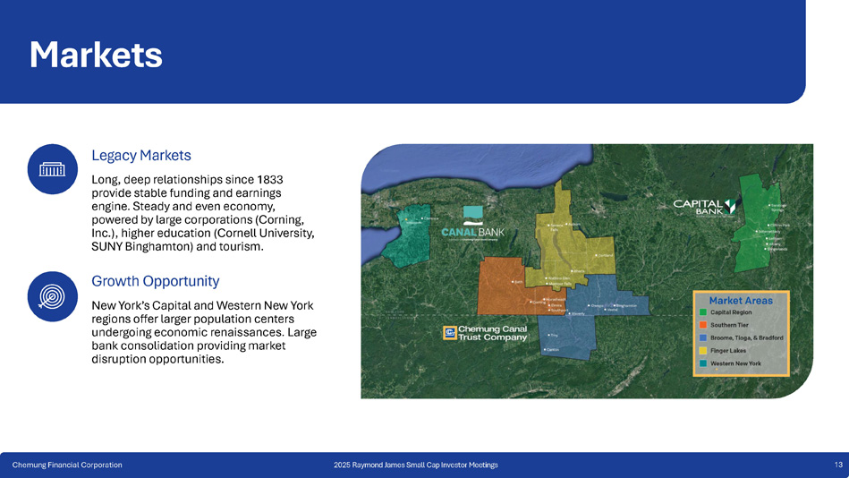 Chemung Financial Corporation Corporate Organization 12 Trust and Wealth Management services Provides mutual funds, securities and insurance brokerage services through LPL Financial Banking operations in Southern Tier and Finger Lakes of New York Wealth Management Group Banking operations in the Capital District of New York Banking operations in the greater Buffalo area of New York 2025 Raymond James Small Cap Investor Meetings Chemung Financial Corporation Markets 13 Legacy Markets Long, deep relationships since 1833 provide stable funding and earnings engine.