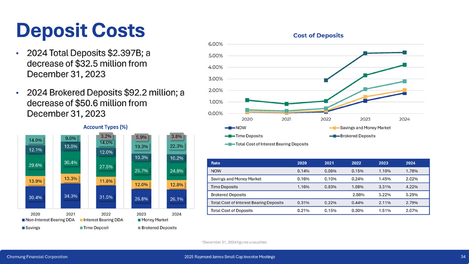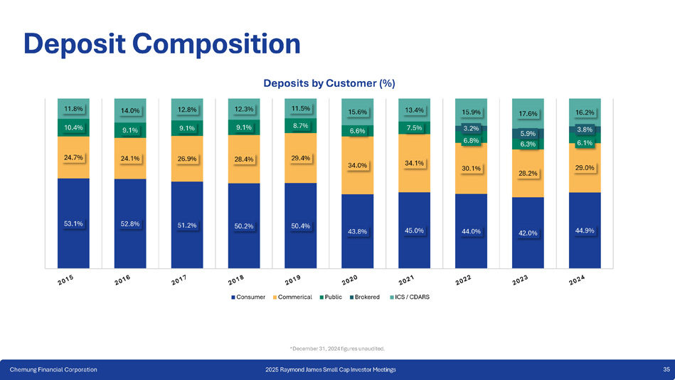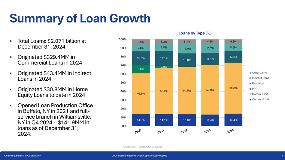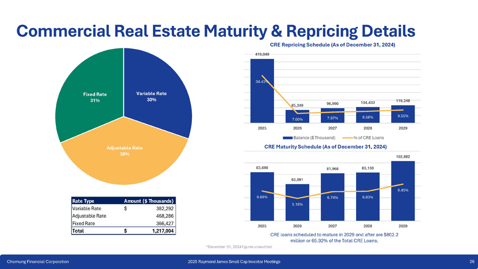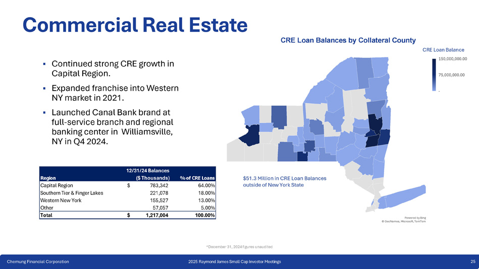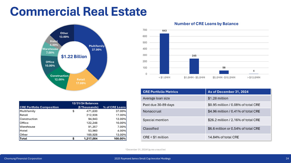 *December 31, 2024 figures unaudited 2025 Raymond James Small Cap Investor Meetings Chemung Financial Corporation 35.39% 18.05% 26.29% 9.36% 6.82% 0.04% 4.05% Loan Types Non-Owner Occupied Commercial & Industrial Multi-Family Owner Occupied Construction Agricultural & Farmland Other 69.58% 2.96% 3.85% 1.59% 3.88% 5.48% 3.66% 9.00% NAICS Descriptions Real Estate, Rental & Leasing Manufacturing Health Care & Social Assistance Wholesale Trade Construction Accommodation & Food Services Arts, Entertainment & Recreation Other NAICS Code / Descriptions Balances ($ Thousands) Percentage Real Estate, Rental & Leasing 1,055,003$ 69.58% Manufacturing 44,945 2.96% Health Care & Social Assistance 58,351 3.85% Wholesale Trade 24,112 1.59% Construction 58,880 3.88% Accommodation & Food Services 83,169 5.48% Arts, Entertainment & Recreation 55,504 3.66% Other 136,561 9.00% Total 1,516,525$ 100.00% Loan Types Non-Owner Occupied 536,680$ 35.39% Commercial & Industrial 273,708 18.05% Multi-Family 398,728 26.29% Owner Occupied 141,966 9.36% Construction 103,361 6.82% Agricultural & Farmland 627 0.04% Other 61,455 4.05% Total 1,516,525$ 100.00% Commercial Loan Portfolio – December 31, 2024 23 *December 31, 2024 figures unaudited 2025 Raymond James Small Cap Investor Meetings Chemung Financial Corporation CRE Portfolio Composition 12/31/24 Balances ($ Thousands) % of CRE Loans Multifamily 471,630$ 37.00% Retail 212,938 17.00% Construction 94,943 12.00% Office 122,248 10.00% Warehouse 91,357 7.00% Hotel 53,960 4.00% Other 169,928 13.00% Total 1,217,004$ 100.00% 643 245 56 4 0 100 200 300 400 500 600 700 < $1.0MM $1.0MM - $5.0MM $5.0MM - $10.0MM > $10.0MM Number of CRE Loans by Balance Multifamily 37.00% Retail 17.00% Construction 12.00% Office 10.00% Warehouse 7.00% Hotel 4.00% Other 13.00% $1.22 Billion Commercial Real Estate 24 *December 31, 2024 figures unaudited 2025 Raymond James Small Cap Investor Meetings As of December 31, 2024 CRE Portfolio Metrics $1.28 million Average loan size $0.95 million / 0.08 % of total CRE Past due 30 - 89 days $4.96 million / 0.41% of total CRE Nonaccrual $26.2 million / 2.16% of total CRE Special mention $6.6 million or 0.54% of total CRE Classified 14.84% of total CRE CRE < $1 million