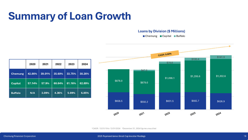 Steady and even economy, powered by large corporations (Corning, Inc.), higher education (Cornell University, SUNY Binghamton) and tourism. Growth Opportunity New York’s Capital and Western New York regions offer larger population centers undergoing economic renaissances. Large bank consolidation providing market disruption opportunities. 2025 Raymond James Small Cap Investor Meetings Chemung Financial Corporation Dominant market share of deposits Legacy Markets Small share of much larger markets; a lot of room to grow.