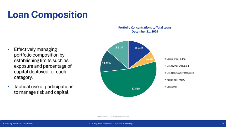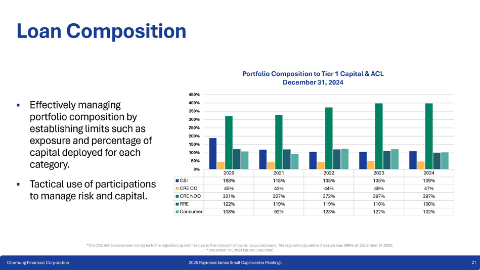*December 31, 2024 figures unaudited 2025 Raymond James Small Cap Investor Meetings Chemung Financial Corporation $658.5 $592.2 $651.5 $665.7 $626.9 $878.0 $879.0 $1,098.1 $1,206.6 $1,302.6 $47.0 $79.8 $100.4 $141.9 Loans by Division ($ Millions) Chemung Capital Buffalo Summary of Loan Growth 2024 2023 2022 2021 2020 30.26% 33.75% 35.60% 39.01% 42.86% Chemung 62.89% 61.16% 60.04% 57.9% 57.14% Capital 6.85% 5.09% 4.36% 3.09% N/A Buffalo 19 *CAGR: 12/31/19 to 12/31/2024 *December 31, 2024 figures unaudited 2025 Raymond James Small Cap Investor Meetings Chemung Financial Corporation Loan Composition 20 ▪ Effectively managing portfolio composition by establishing limits such as exposure and percentage of capital deployed for each category.
