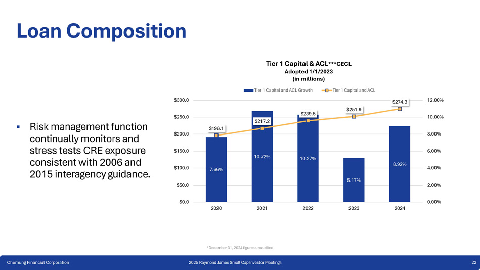 Consumer Chemung Financial Corporation 2020 2021 2022 2023 2024 C&I 188% 118% 105% 105% 109% CRE OO 45% 43% 44% 49% 47% CRE NOO 321% 327% 372% 397% 397% RRE 122% 119% 119% 110% 100% Consumer 108% 92% 123% 122% 102% 0% 50% 100% 150% 200% 250% 300% 350% 400% 450% Portfolio Composition to Tier 1 Capital & ACL December 31, 2024 Loan Composition 21 ▪ Effectively managing portfolio composition by establishing limits such as exposure and percentage of capital deployed for each category. ▪ Tactical use of participations to manage risk and capital. *The CRE Ratio above does not agree to the regulatory guidelines due to the inclusion of owner - occupied loans. The regulatory gu ideline measure was 399% at December 31,2024.