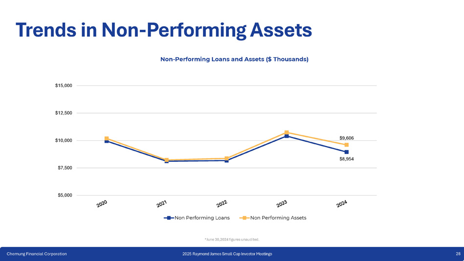 Variable Rate 30% Adjustable Rate 39% Fixed Rate 31% Chemung Financial Corporation 0.35% 0.43% 0.00% 0.10% 0.20% 0.30% 0.40% 0.50% 0.60% 0.70% Non - Performing Loans and Assets (% of Total) Non-performing assets to total assets Non-performing loans to total loans Trends in Non - Performing Assets 27 *December 31, 2024 figures unaudited. 2025 Raymond James Small Cap Investor Meetings Chemung Financial Corporation $8,954 $9,606 $5,000 $7,500 $10,000 $12,500 $15,000 Non - Performing Loans and Assets ($ Thousands) Non Performing Loans Non Performing Assets Trends in Non - Performing Assets 28 *June 30,2024 figures unaudited.