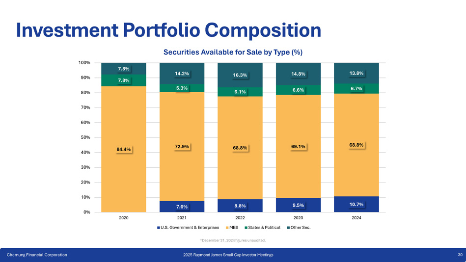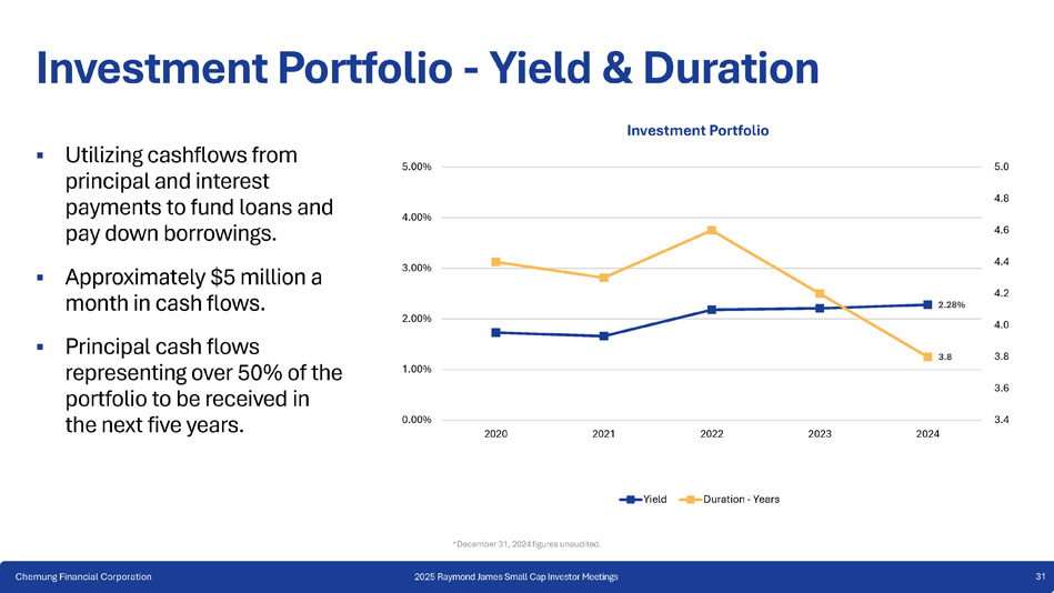 2025 Raymond James Small Cap Investor Meetings Chemung Financial Corporation 7.6% 8.8% 9.5% 10.7% 84.4% 72.9% 68.8% 69.1% 68.8% 7.8% 5.3% 6.1% 6.6% 6.7% 7.8% 14.2% 16.3% 14.8% 13.8% 0% 10% 20% 30% 40% 50% 60% 70% 80% 90% 100% 2020 2021 2022 2023 2024 Securities Available for Sale by Type (%) U.S. Government & Enterprises MBS States & Political Other Sec. Investment Portfolio Composition 30 *December 31, 2024 figures unaudited.