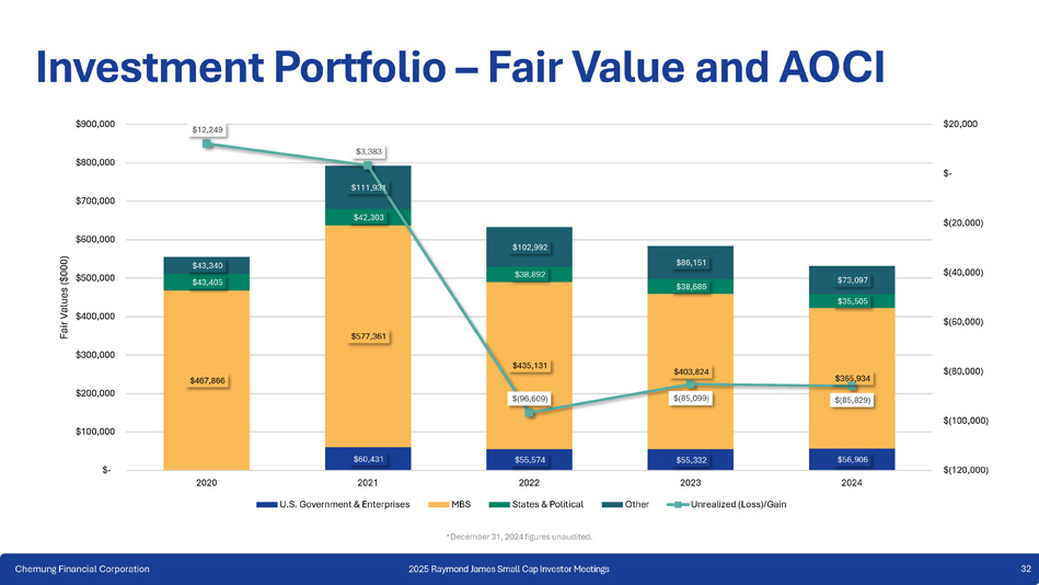 2025 Raymond James Small Cap Investor Meetings Chemung Financial Corporation 2.28% 3.8 3.4 3.6 3.8 4.0 4.2 4.4 4.6 4.8 5.0 0.00% 1.00% 2.00% 3.00% 4.00% 5.00% 2020 2021 2022 2023 2024 Investment Portfolio Yield Duration - Years Investment Portfolio - Yield & Duration 31 ▪ Utilizing cashflows from principal and interest payments to fund loans and pay down borrowings. ▪ Approximately $5 million a month in cash flows. ▪ Principal cash flows representing over 50% of the portfolio to be received in the next five years. *December 31, 2024 figures unaudited.