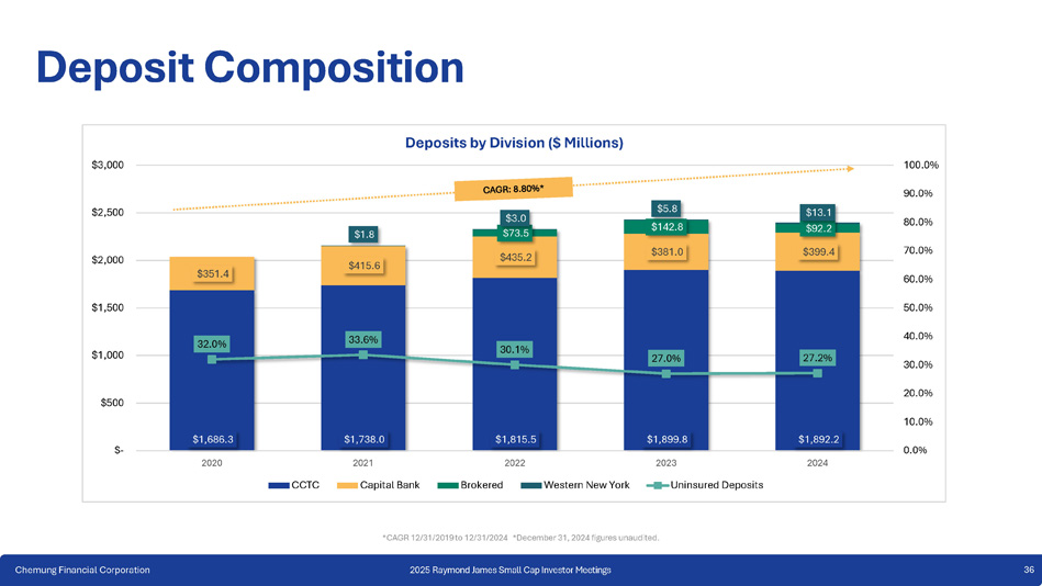 2025 Raymond James Small Cap Investor Meetings Chemung Financial Corporation 2024 2023 2022 2021 2020 Rate 1.78% 1.10% 0.15% 0.08% 0.14% NOW 2.02% 1.45% 0.24% 0.10% 0.16% Savings and Money Market 4.22% 3.31% 1.08% 0.83% 1.16% Time Deposits 5.29% 5.22% 2.88% Brokered Deposits 2.79% 2.11% 0.44% 0.22% 0.31% Total Cost of Interest Bearing Deposits 2.07% 1.51% 0.30% 0.15% 0.21% Total Cost of Deposits Deposit Costs 34 • 2024 Total Deposits $2.397B; a decrease of $32.5 million from December 31, 2023 • 2024 Brokered Deposits $92.2 million; a decrease of $50.6 million from December 31, 2023 *December 31, 2024 figures unaudited. 2025 Raymond James Small Cap Investor Meetings 30.4% 34.3% 31.5% 26.8% 26.1% 13.9% 13.3% 11.8% 12.0% 12.8% 29.6% 30.4% 27.5% 25.7% 24.8% 12.1% 13.0% 12.0% 10.3% 10.2% 14.0% 9.0% 14.0% 19.3% 22.3% 3.2% 5.9% 3.8% 2020 2021 2022 2023 2024 Account Types (%) Non-Interest Bearing DDA Interest Bearing DDA Money Market Savings Time Deposit Brokered Deposits 0.00% 1.00% 2.00% 3.00% 4.00% 5.00% 6.00% 2020 2021 2022 2023 2024 Cost of Deposits NOW Savings and Money Market Time Deposits Brokered Deposits Total Cost of Interest Bearing Deposits Chemung Financial Corporation 53.1% 52.8% 51.2% 50.2% 50.4% 43.8% 45.0% 44.0% 42.0% 44.9% 24.7% 24.1% 26.9% 28.4% 29.4% 34.0% 34.1% 30.1% 28.2% 29.0% 10.4% 9.1% 9.1% 9.1% 8.7% 6.6% 7.5% 6.8% 6.3% 6.1% 3.2% 5.9% 3.8% 11.8% 14.0% 12.8% 12.3% 11.5% 15.6% 13.4% 15.9% 17.6% 16.2% Deposits by Customer (%) Consumer Commerical Public Brokered ICS / CDARS Deposit Composition 35 *December 31, 2024 figures unaudited.